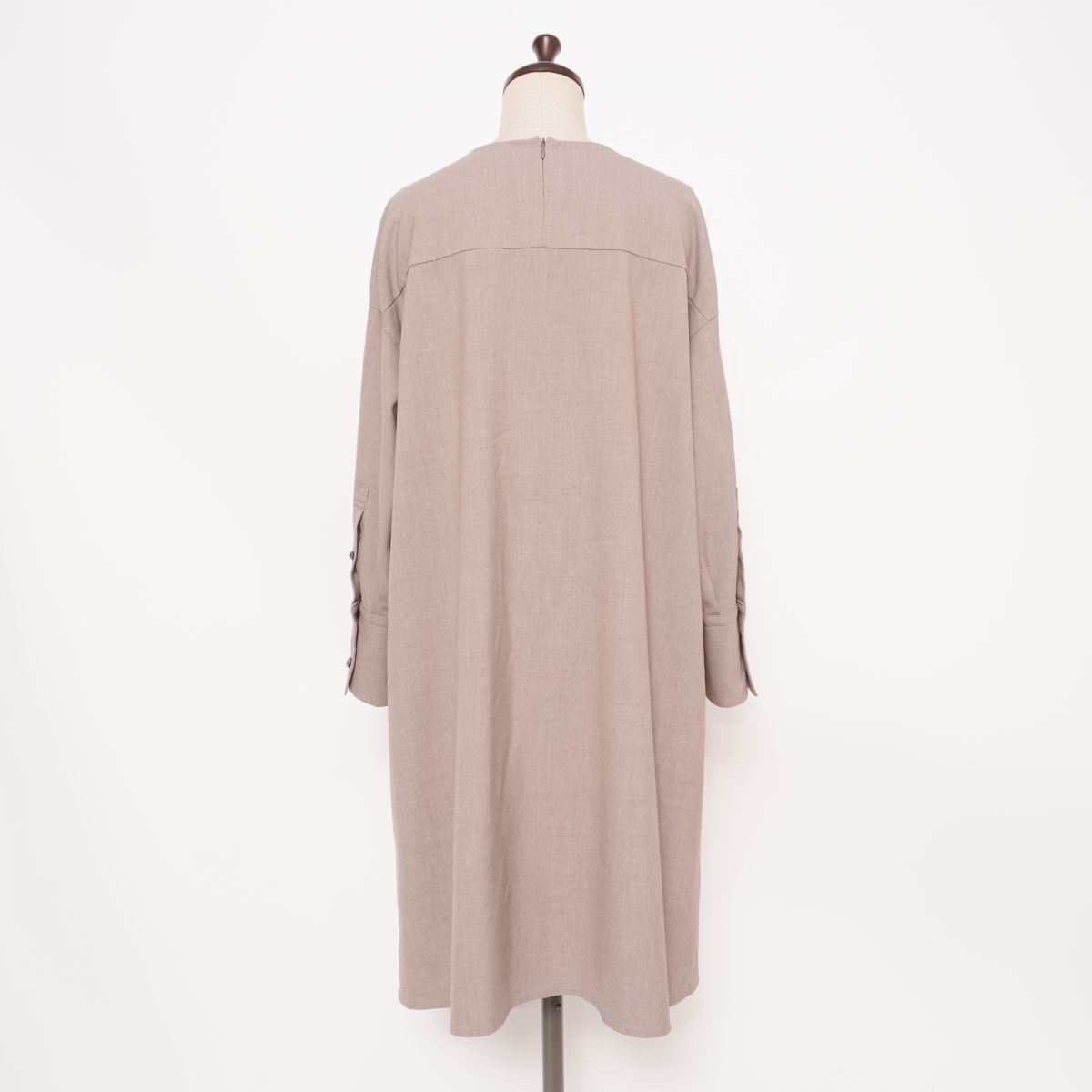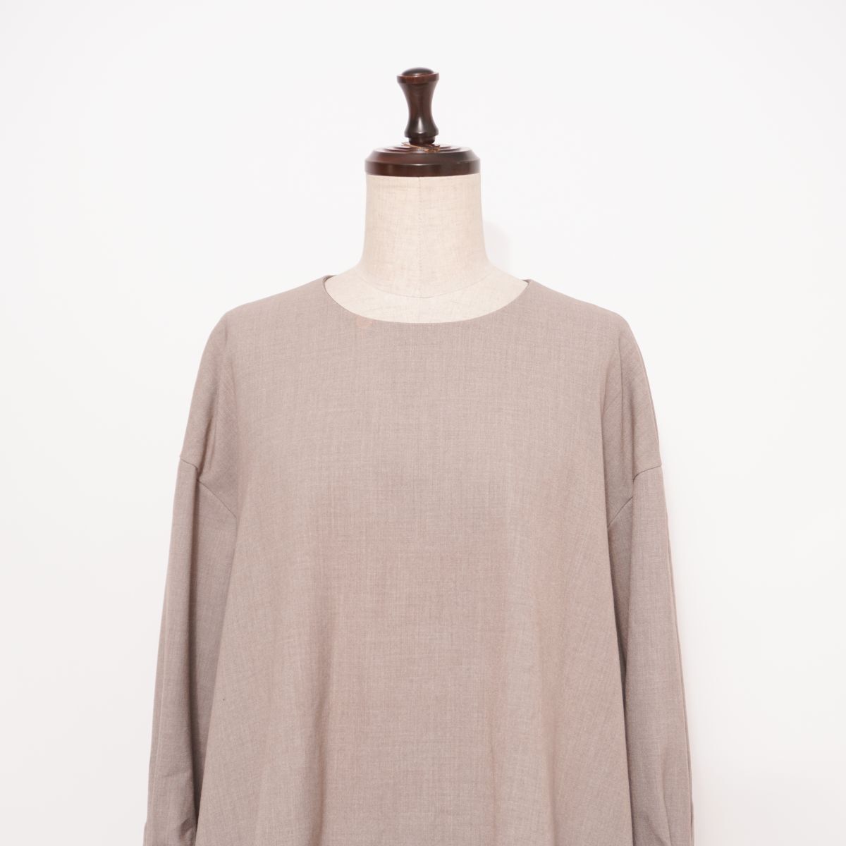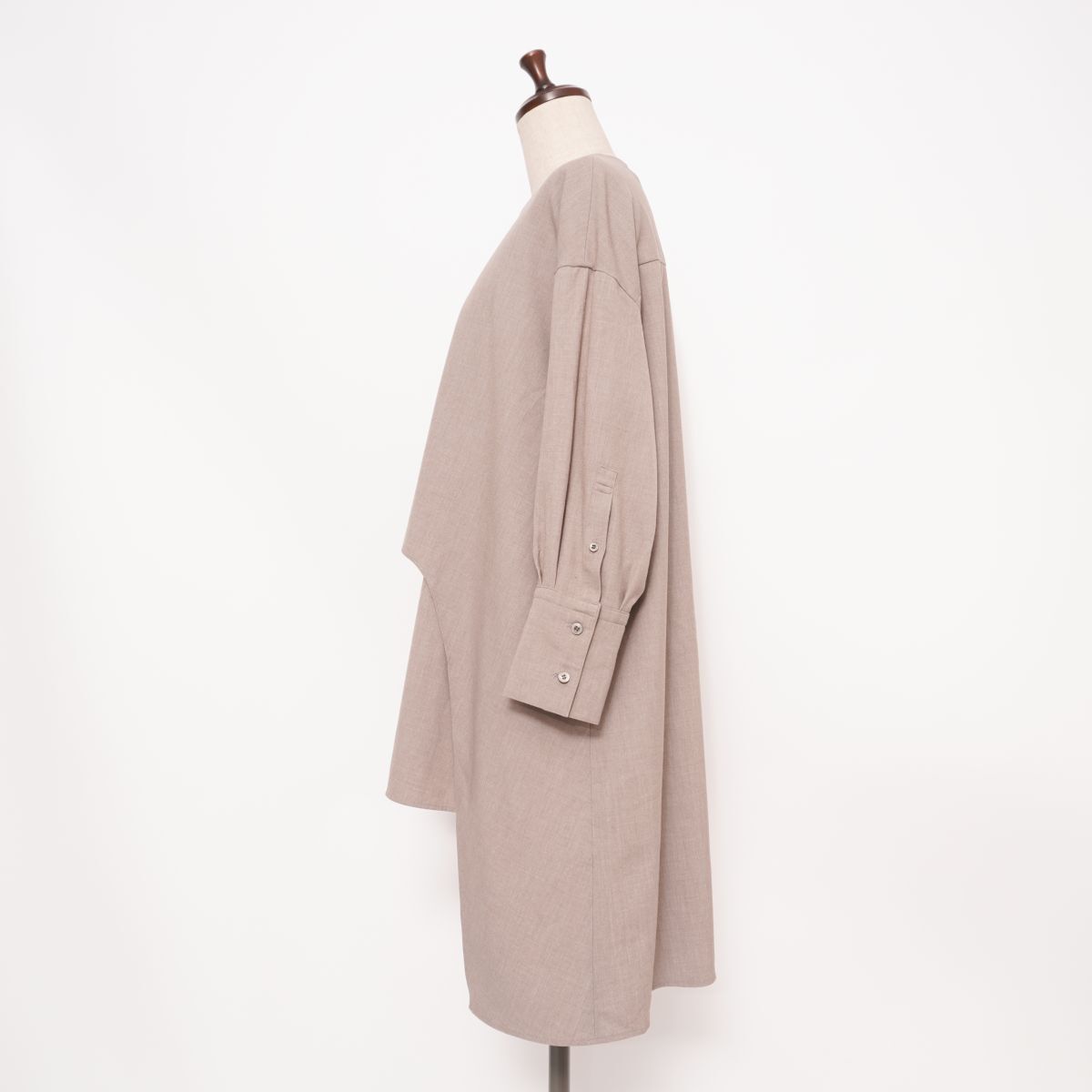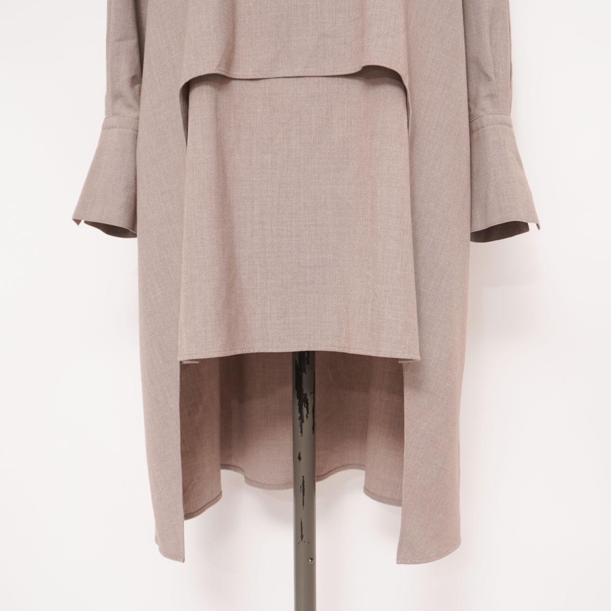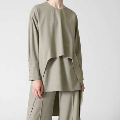 ポリエステルとレーヨンの混紡糸を使用した2WAYストレッチ素材を使ったロングブラウスです。なめらかな光沢感と適度なハリ感が特徴的な素材です。切り替えデザインを施した大胆な前後差のあるヘムラインがポイントです。同素材のワイドパンツとセットアップで揃えて頂けます。