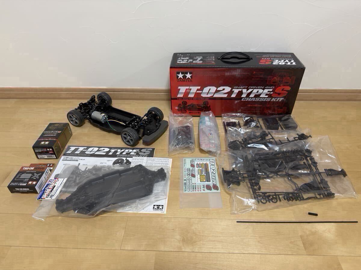 タミヤ 1/10RC TT-02 TYPE-S シャーシキットの出品です。途中まで組み立てておりますが、未走行のため新品に近い状態です。また、組み立てキットに含まれていないモーターやスピードコントローラー、サーボ、ロワデッキもセットになります。写真のものが全てになります。