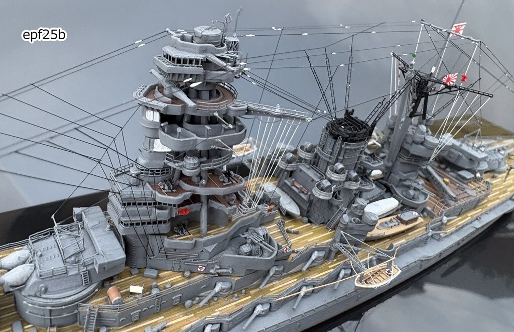 開戦直後の長門は新造時に比べ、全長、全幅で大きくなり、武装は45口径41㎝連装主砲4基8門、41式14㎝単装副砲18門、12.7㎝連装高角砲4基8門、25ミリ連装機銃10基20門、搭載機は95式水上偵察機3機、大型化したことにより新造時より馬力がわずかに増えたものの速力は若干、遅くなり25ノットとなりました。長門は太平洋戦争開戦時連合艦隊旗艦として出撃しています。
