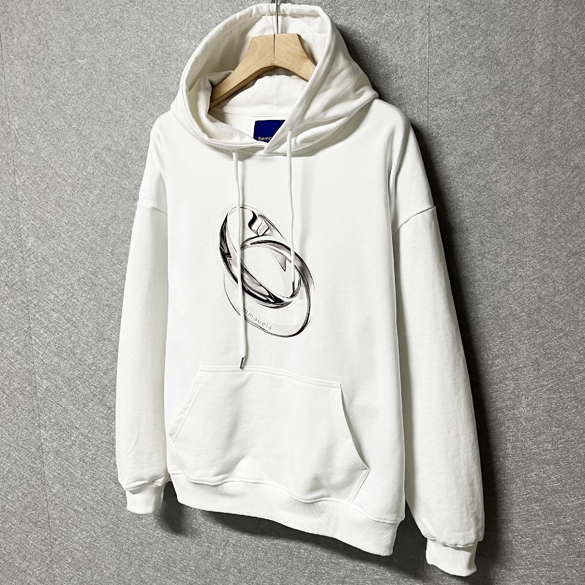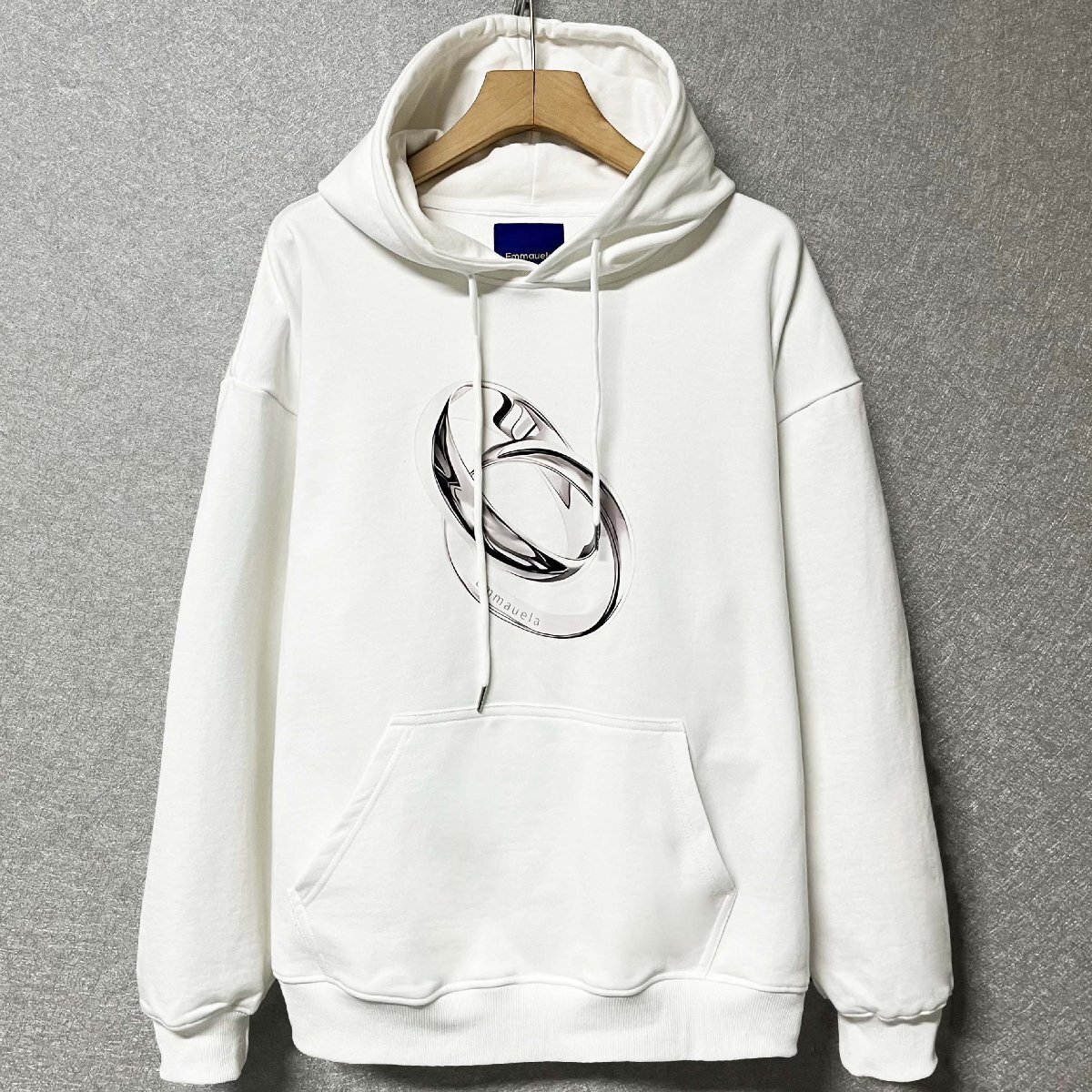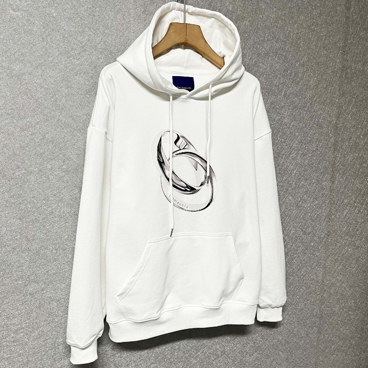 すっきりとしたシルエットとベーシックなフード付きデザインで、どんなスタイルにも合わせやすい万能アイテム。フロントにはシックなカップルリングのプリントが施されており、シンプルながらも洗練された印象を与えます。