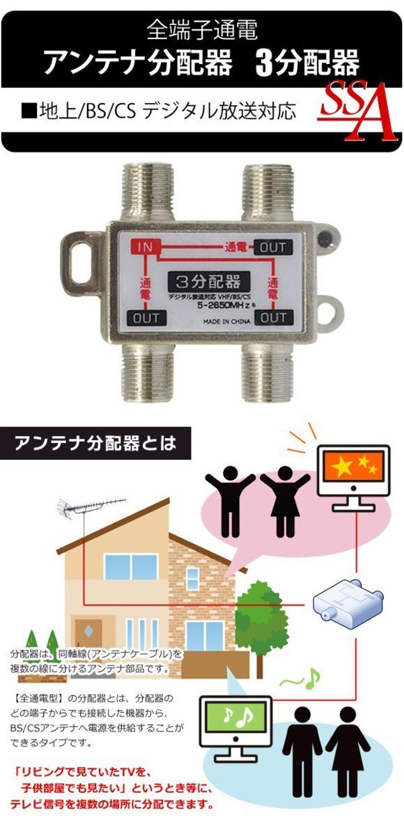 | 地上/BS/CS デジタル放送対応 全端子通電 アンテナ分配器 3分配器 |