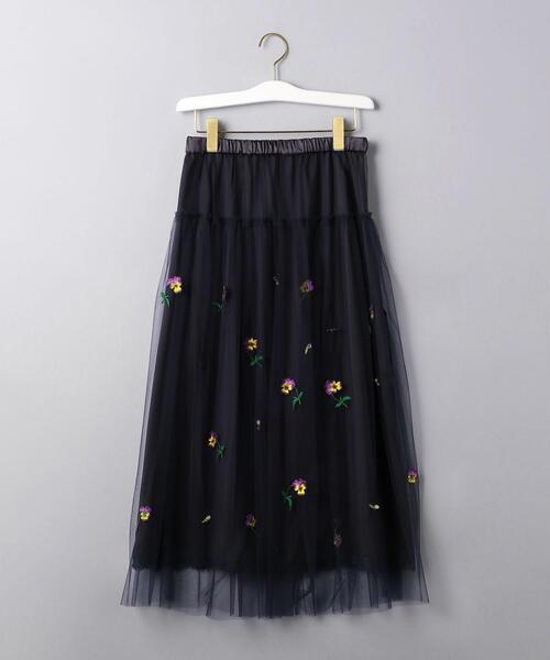 可憐なフラワー刺しゅうを散りばめたフェミニンな印象のチュールスカート。上品な透け感とふんわりとしたボリューム感が魅力。シンプルなTシャツやカジュアルな小物と合わせたラフな着こなしもおすすめです。