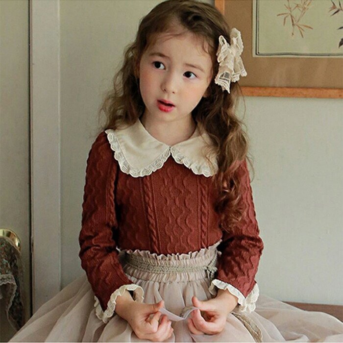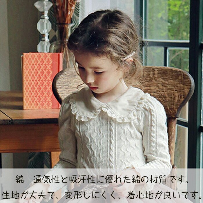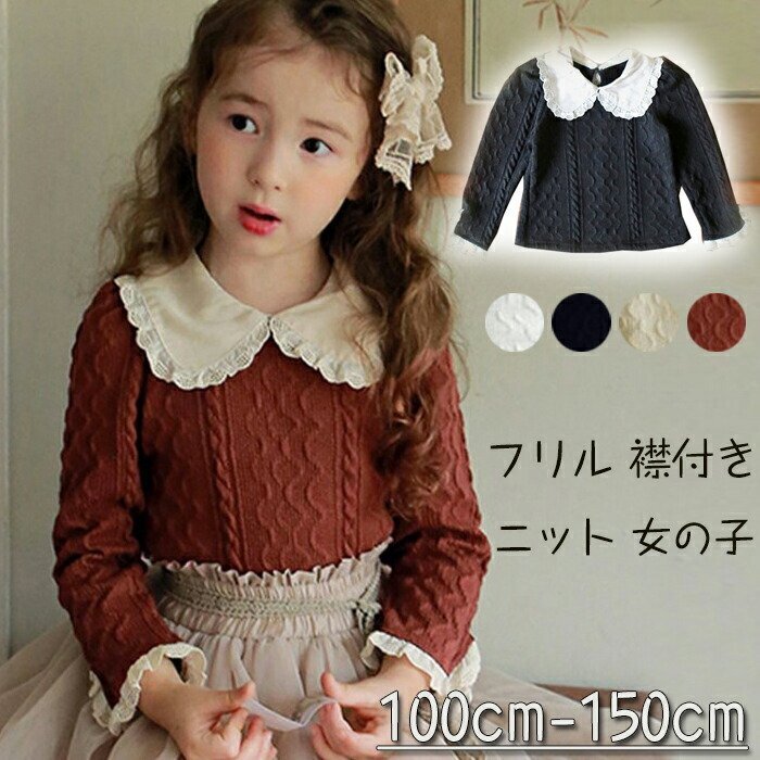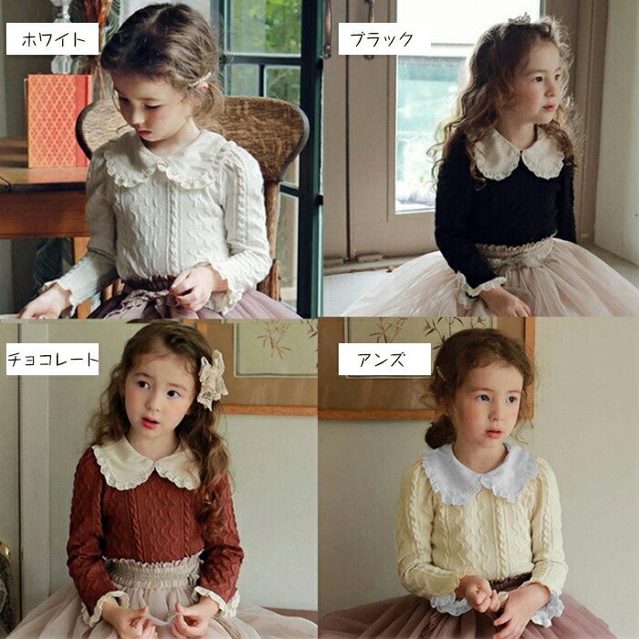 キッズ ニットセーター 女の子 ニットカットソー 綿 襟付き ガールズ フリル ニット セーター トップス インナー 長袖☆4色/80-130選択/1点