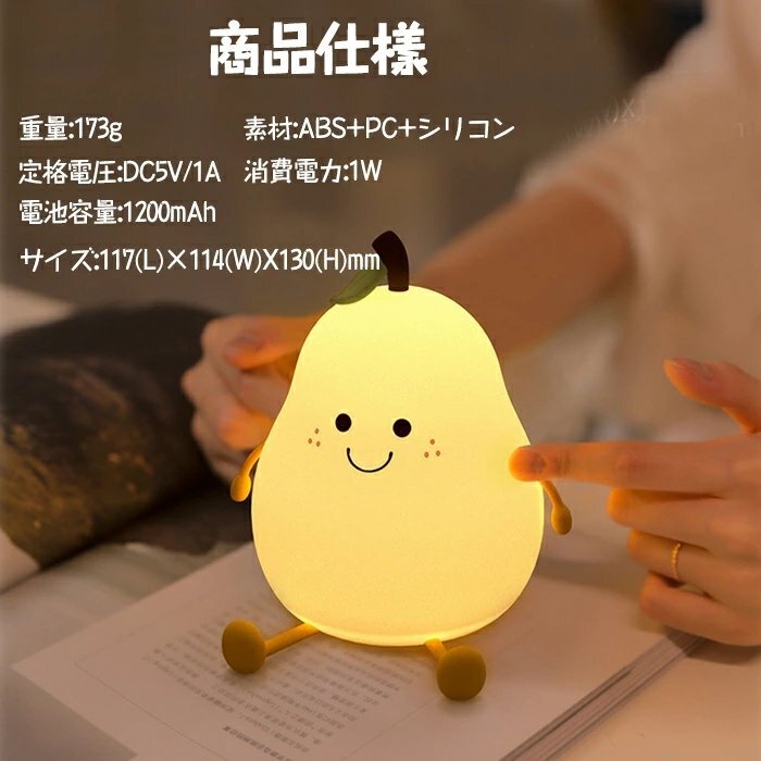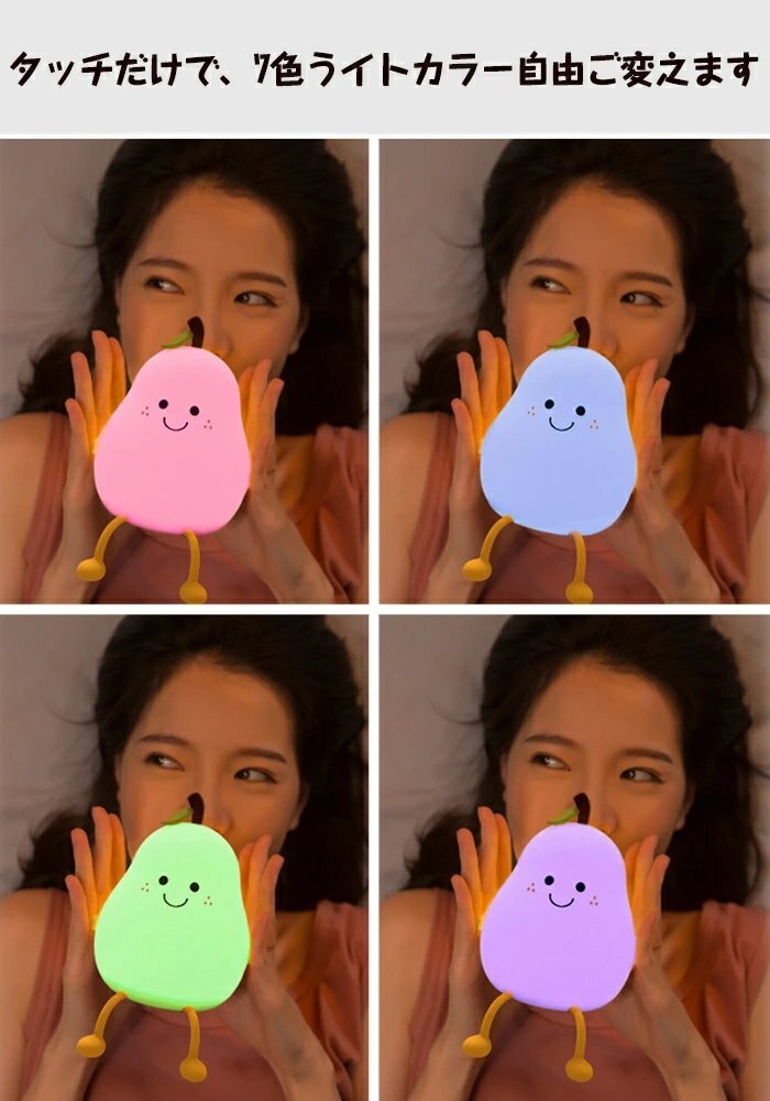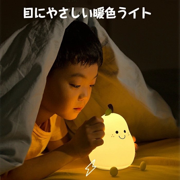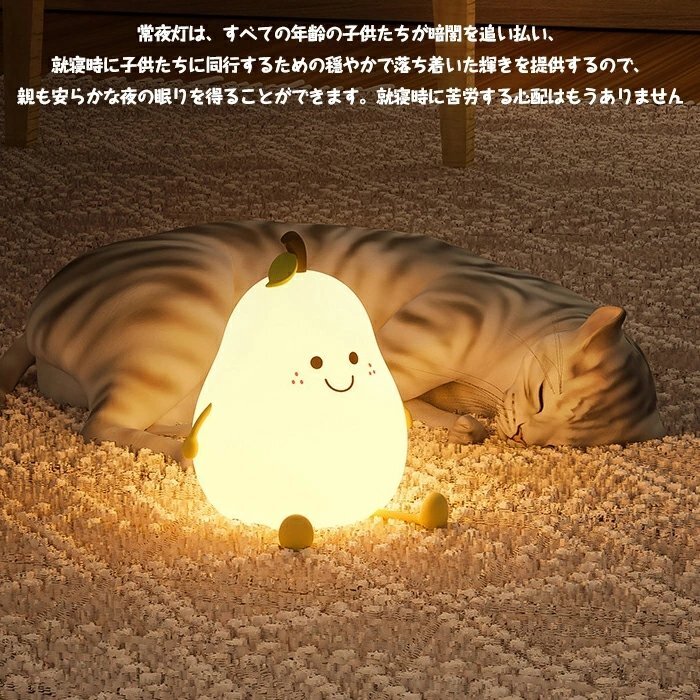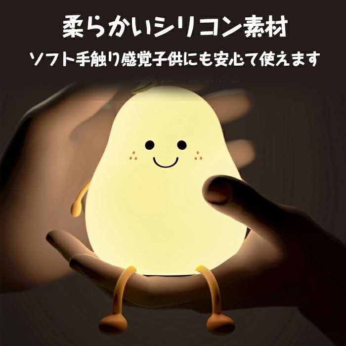 【安全素材のベッドサイドランプ、軽量コンパクト】授乳ライトは安全なシリコンを採用して、柔らかい素材なので、ぶつかったり、投げたりしても割れず、破片で怪我を負う心配もありません。無害で安全です。手乗りサイズの梨形ナイトライトは点灯させても熱くならなくて、子供が遊んでも100%安心です。手元ライトを持ってので、子供たちは夜中のトイレに一人で行けますよ。授乳ライトとして、身近に置くこともできます。枕元に置いても邪魔にならないサイズで、子供部屋に相応しいナイトライト、ルームライト、枕元ライト、テーブルランプ、インテリアです。