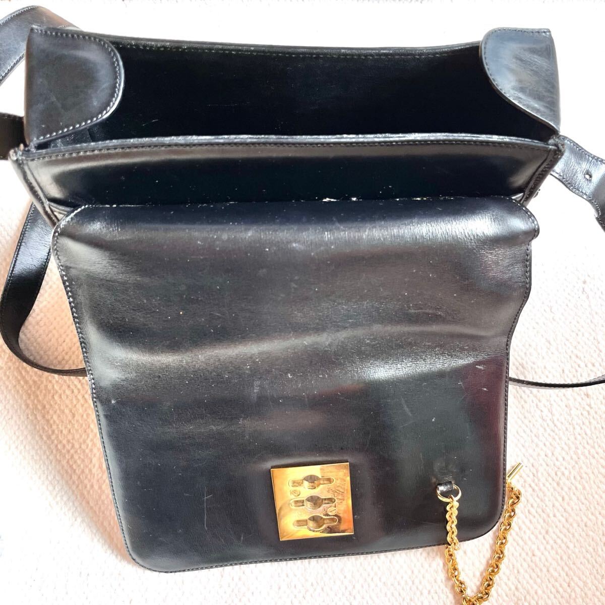 チェーンで蓋が開かない様になっている、珍しいデザインのショルダーバッグです。