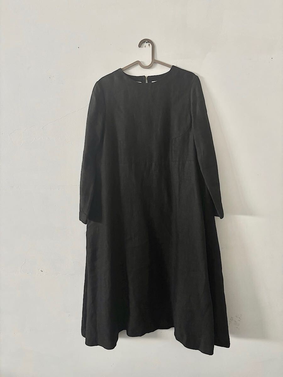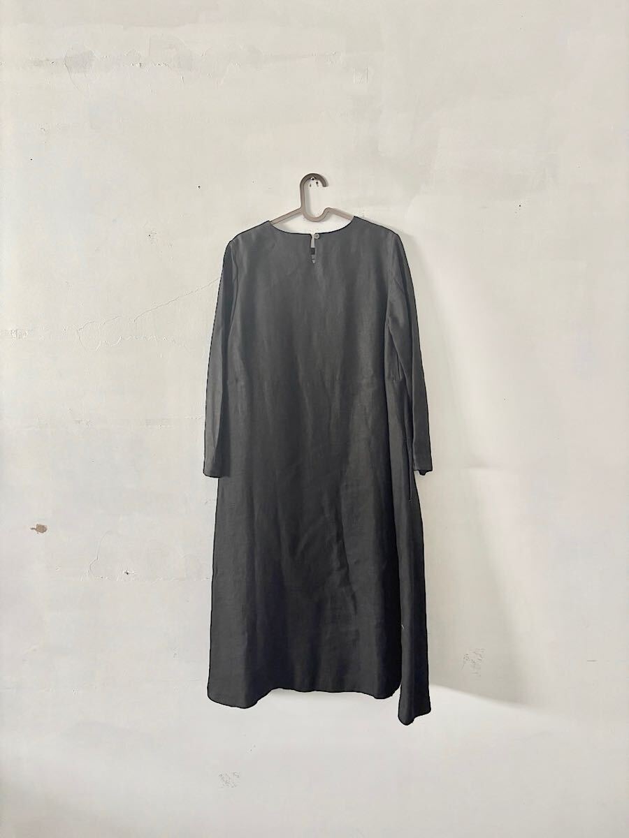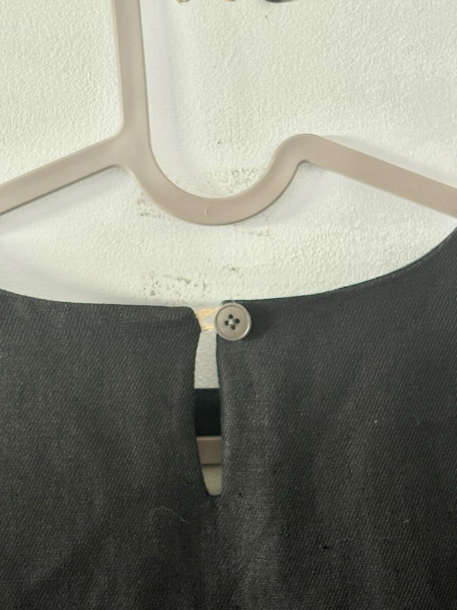 ウエストで切り替えが施されたAラインデザインで、バックネックにループボタン付きのプルオーバータイプです。