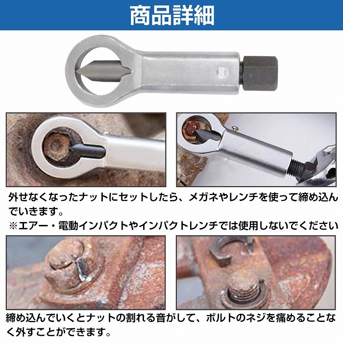 錆びついてしまったり、固く締まって外れないナットを割って外すためのツールです。