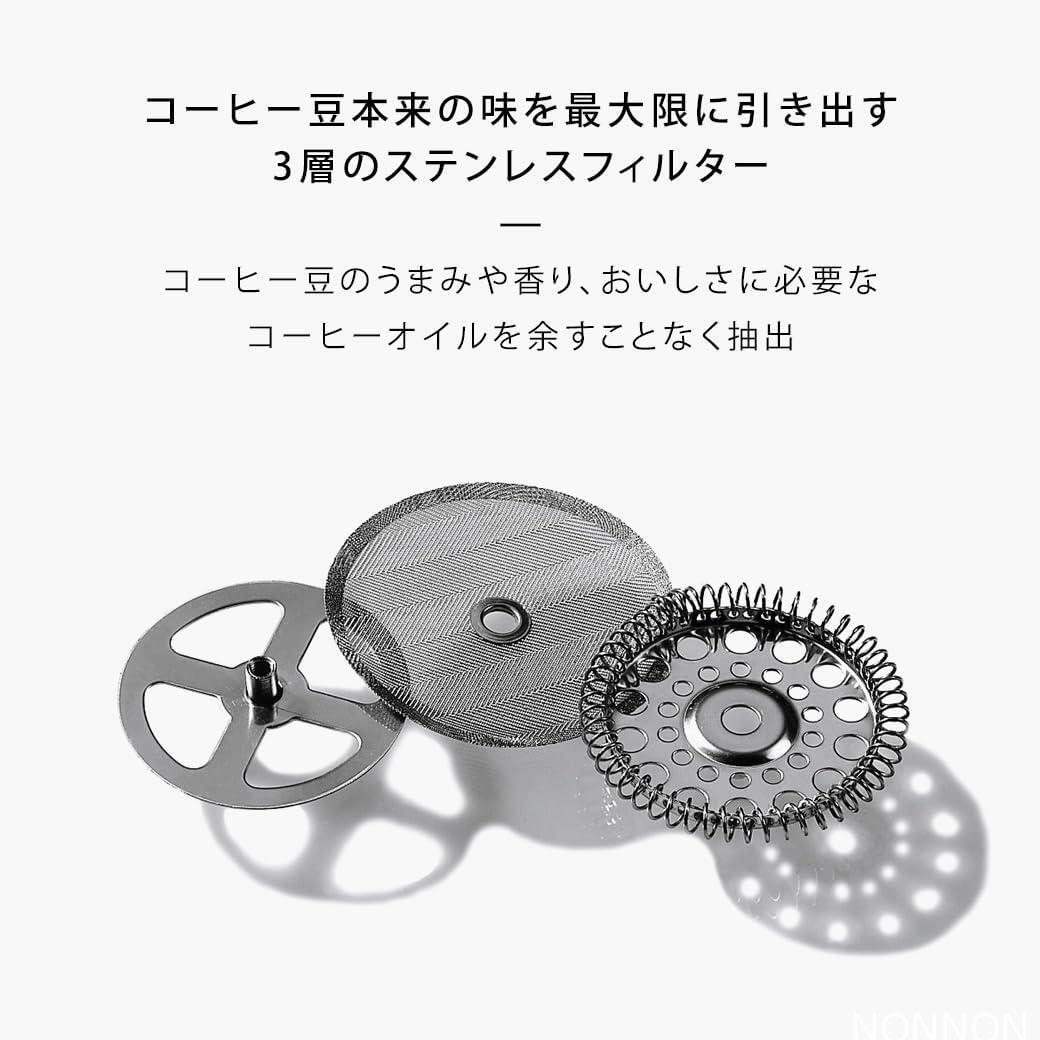 素材:本体=耐熱ガラス / 本体枠、蓋、フィルター=ステンレススチール / 蓋裏=ポリアセタール / コーヒー豆計量スプーン=ポリプロピレン