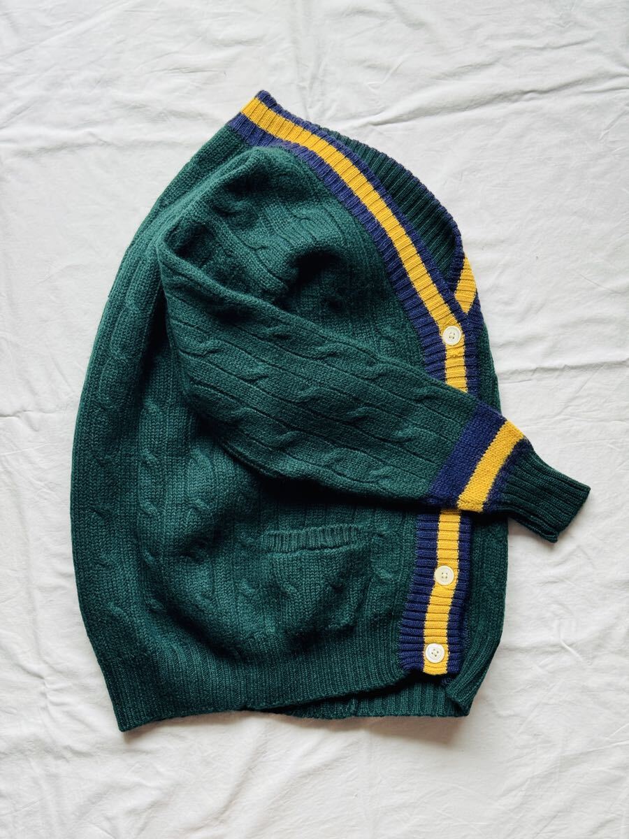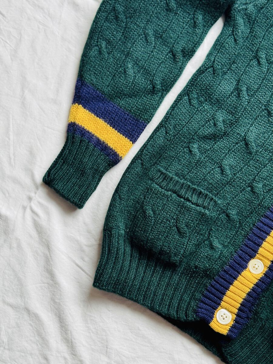 珍しくケーブル編みのカーディガンタイプとなり、クリケットセーターの様なラインが特徴的なデザインです。