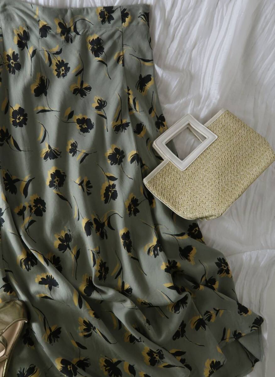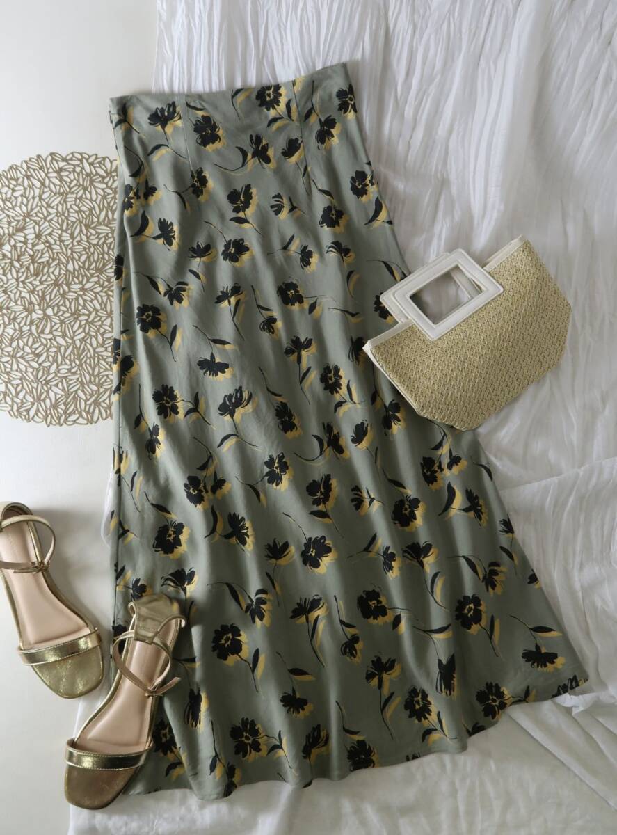 女性らしいフレアラインが魅力のラップ風ロングスカート。