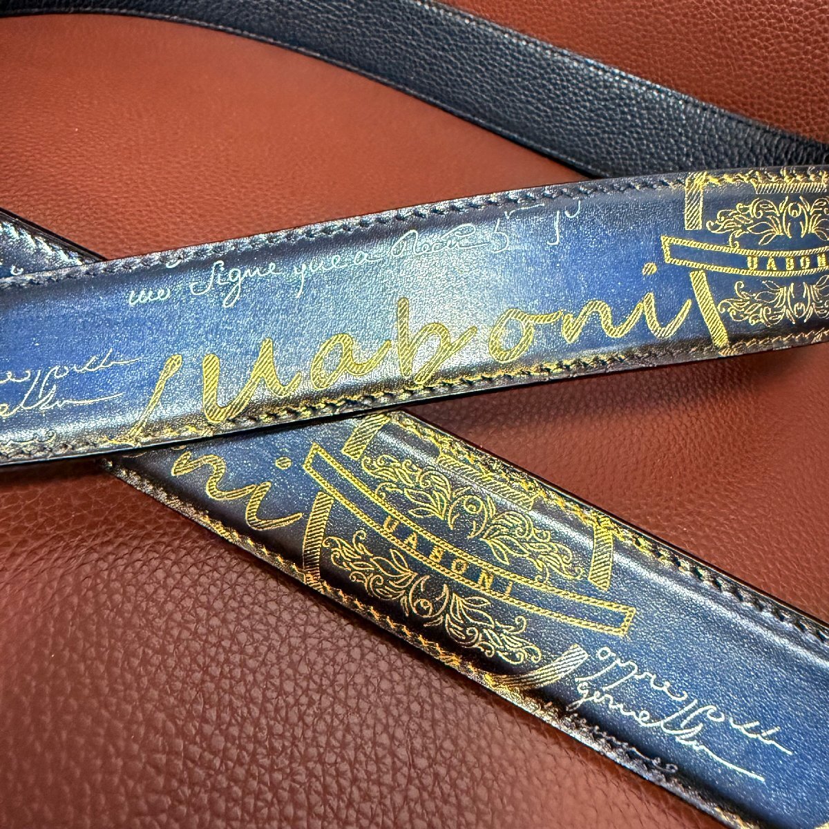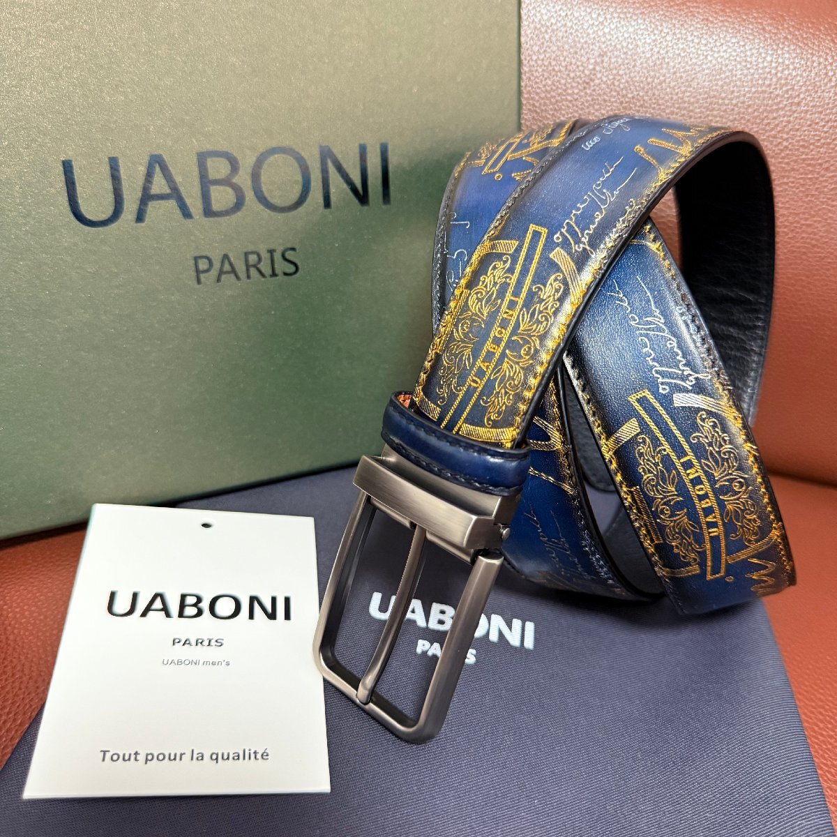 貴重品 EU製 定価9万◆UABONI*ユアボニ*幻のパティーヌ*ベルト◆本革 レザー カーフスキン 手染 ゴールデン 調節可能 ビジネス 紳士用