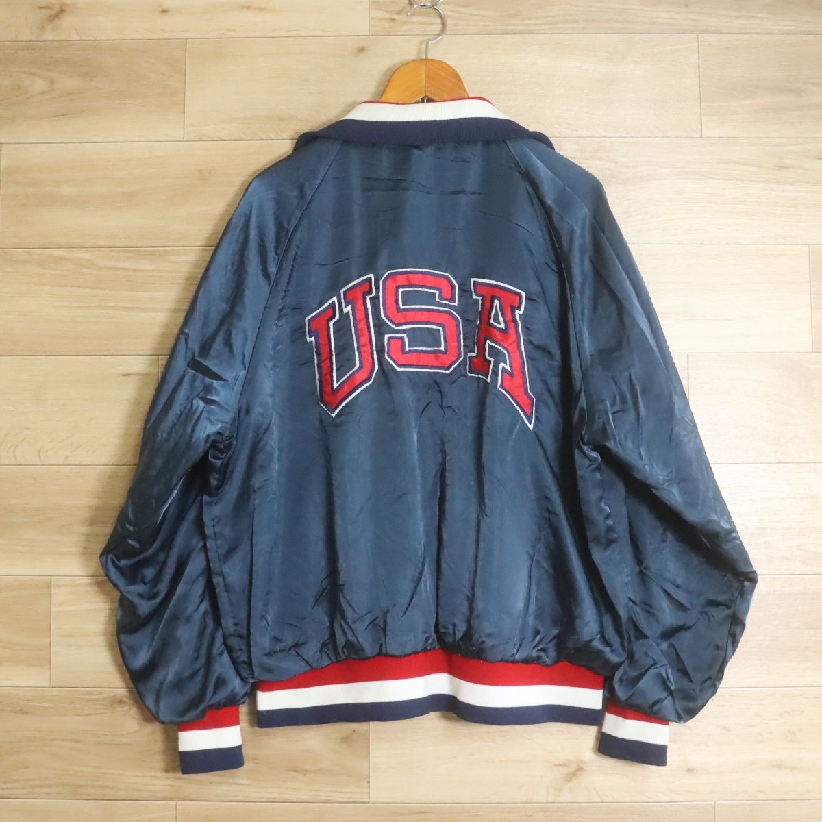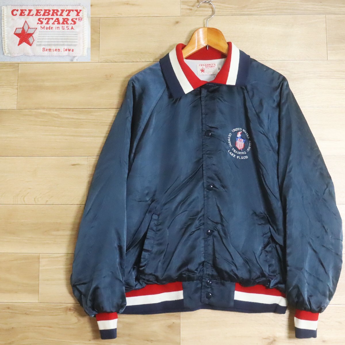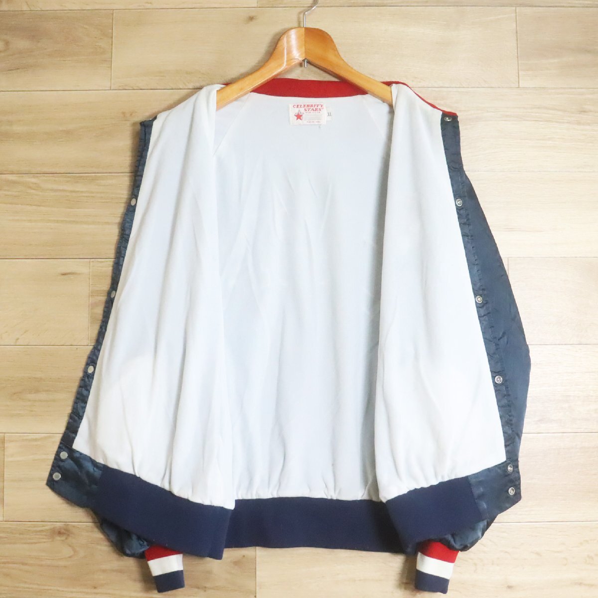 F9R/R7.29-3 80s ビンテージ USA製 CELE BITY STARS ナイロンスタジャン アワードジャケット 刺繍 ブルゾン XL メンズ ネイビー
