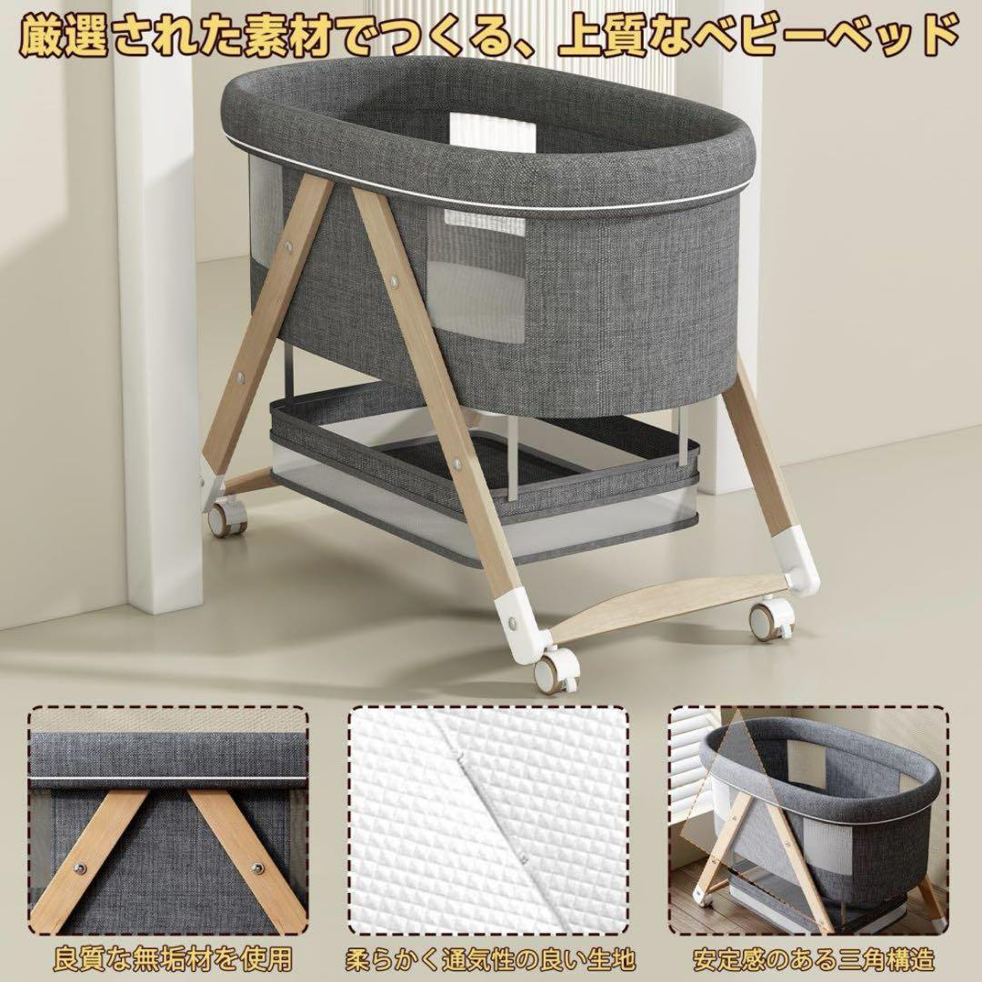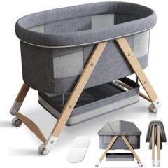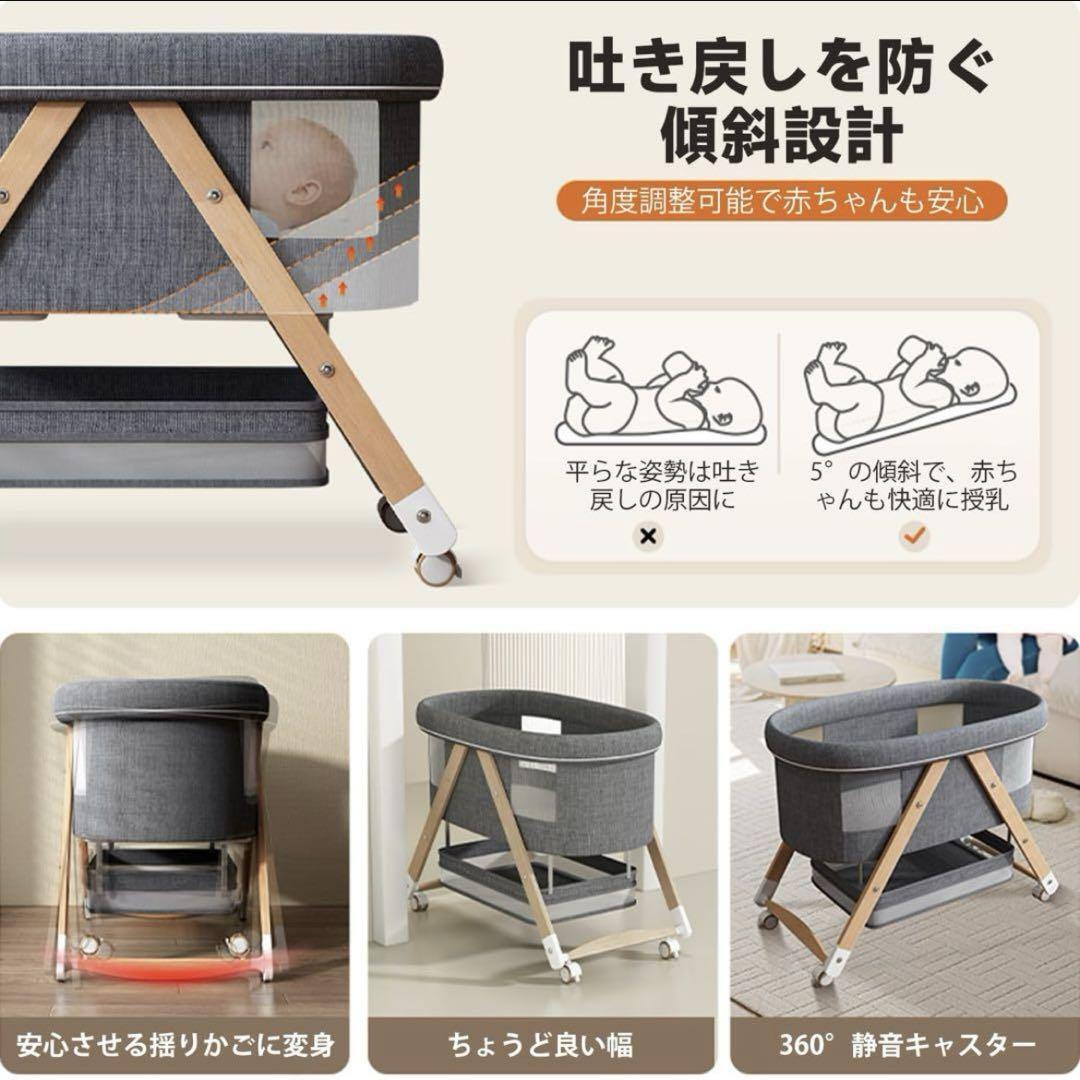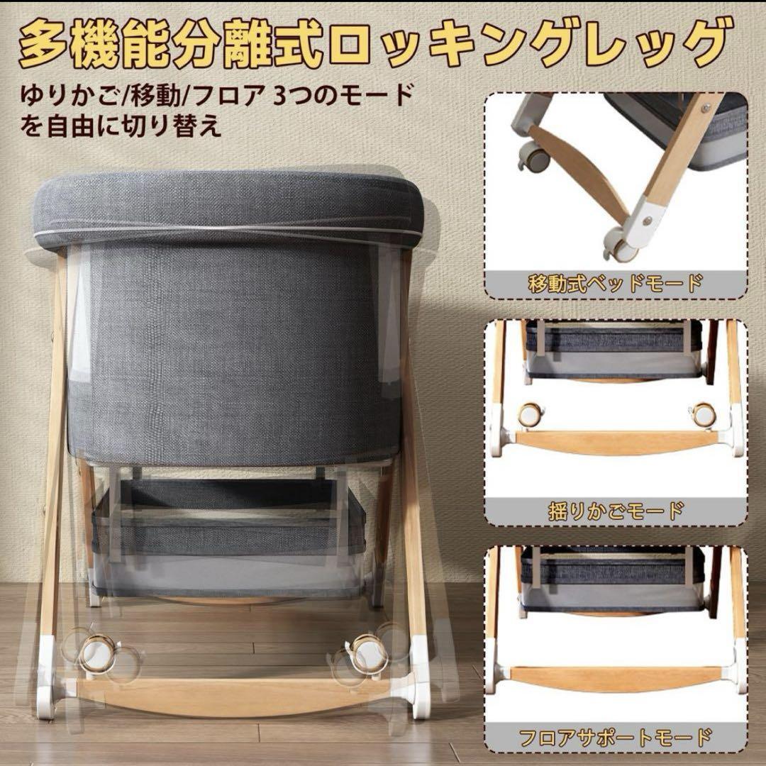 ベビーベッド ゆりかご 3way 折りたたみ 木製 蚊帳 キャスター付き グレー
