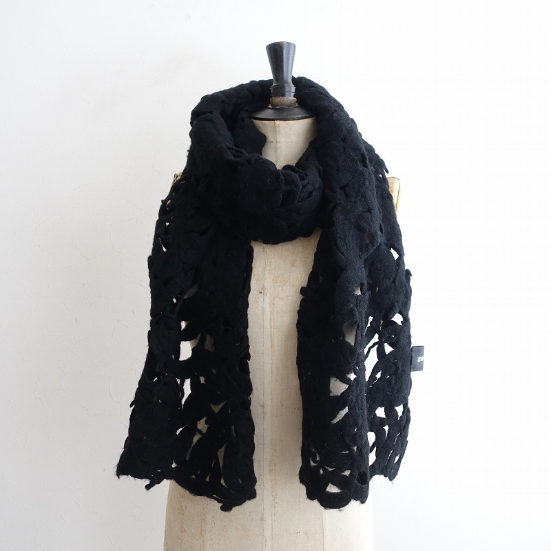 | ZUCCAのフェルトマフラーです。カラーは黒で、フラワーモチーフの圧縮ウール素材であしらわれています。 |