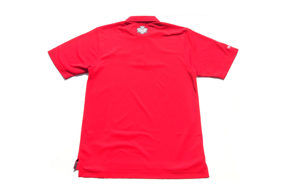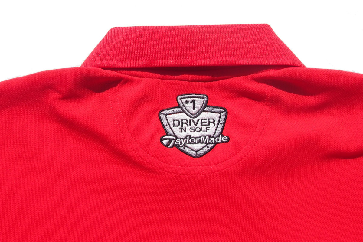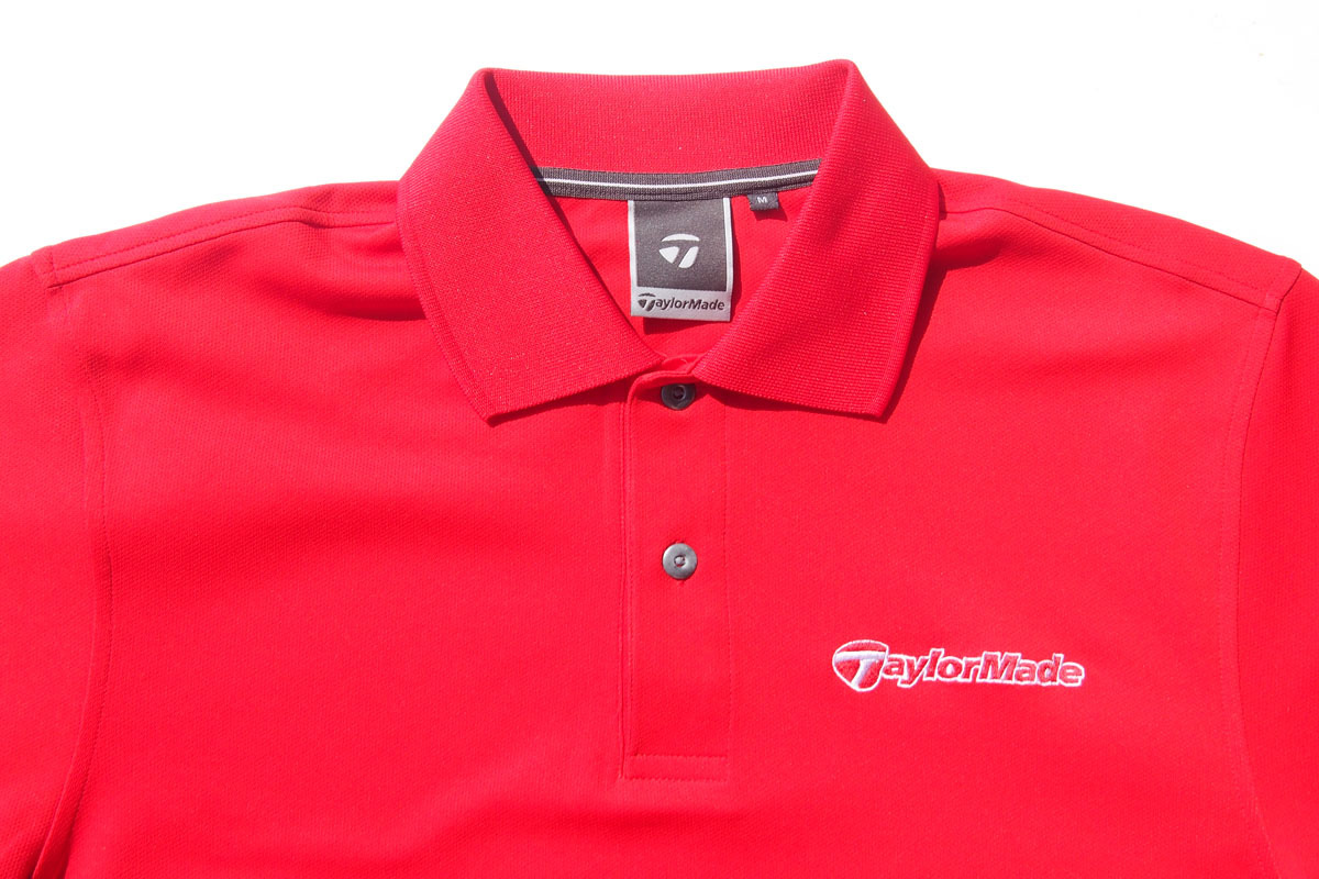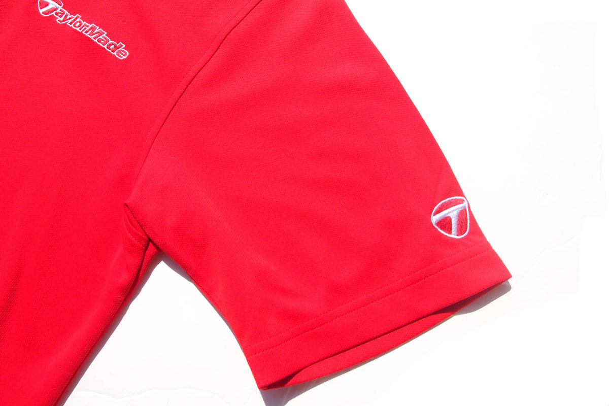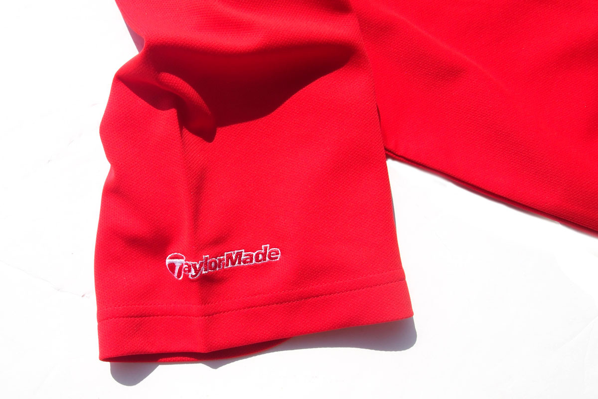 鮮やかなレッドが映える<テーラーメイド>のゴルフポロシャツ。