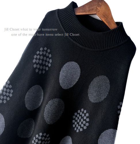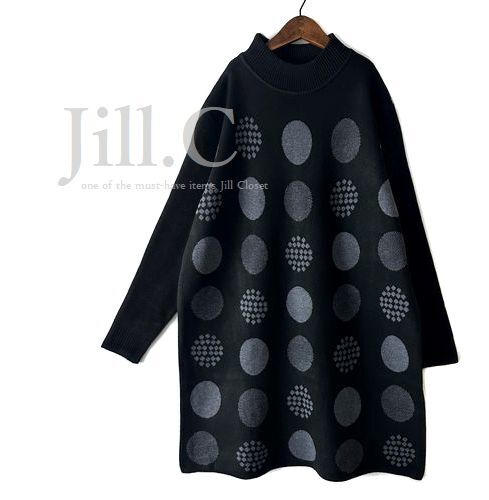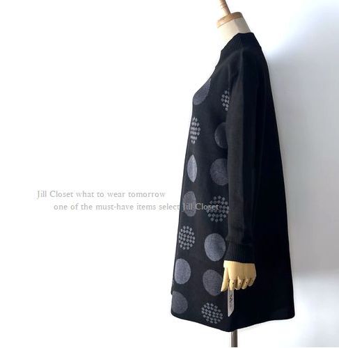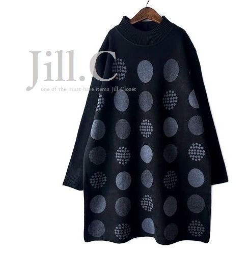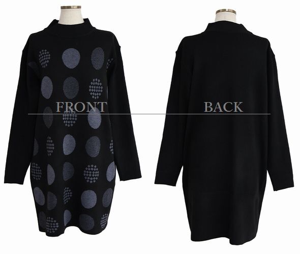 新品【送料185円】伸縮◎ランダムドット柄*ハイゲージニット*ドロップショルダー*プルオーバー*チュニック*ワンピ8003.BLACK