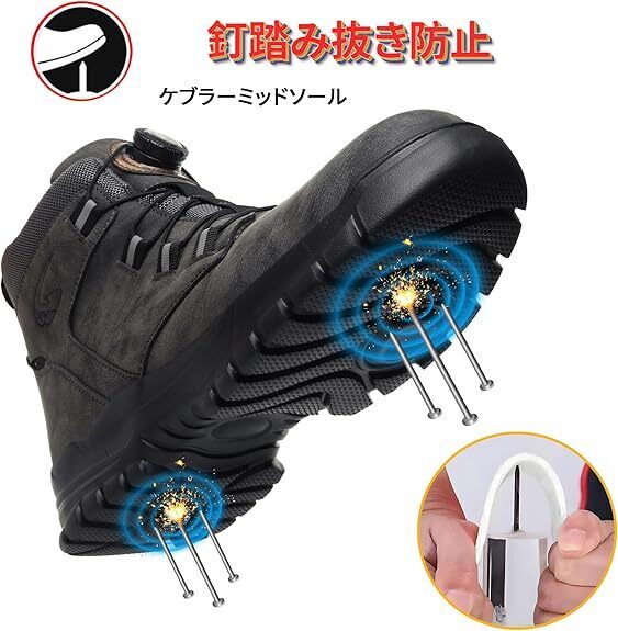 【つま先保護と釘踏み抜き防止】作業靴のつま先部分には、EUの標準認証を受けた良質な鋼先芯が含まれており、危険な作業場でブレードや重量物の衝突から足を保護することができます。作業靴には頑丈なケブラーミッドソールが付いており、穿刺防止性能に優れており、尖った物体が靴底に突き刺さるのを防ぐことができます。