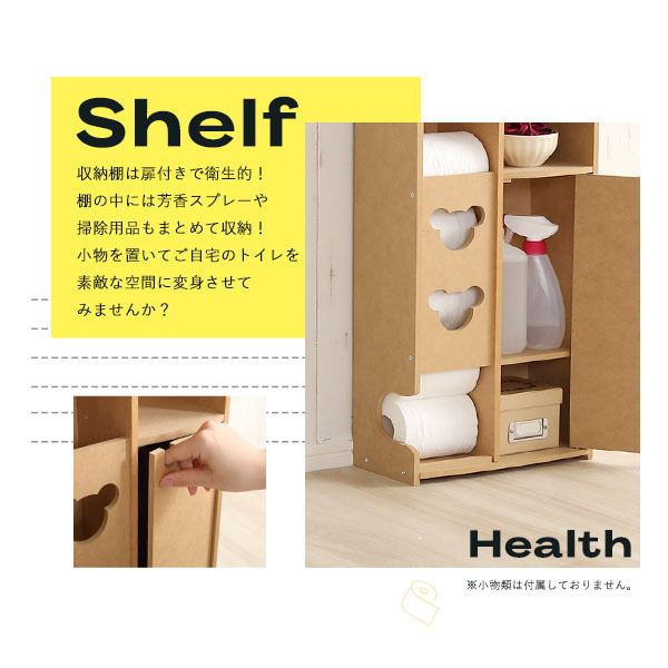 【ポイント】 生活感を抑えるペーパー収納! シンプルなデザインの中にクマ型の切り抜きがワンポイントに♪ トイレットペーパーは最大約6個収納可能です。 奥行わずか16㎝の薄型デザインです。 トイレの限られたスペースにもすっきり収まります。 収納棚は扉付きで衛生的!掃除用品もまとめて収納出来ます。 安心の日本製,軽くて組み立ても簡単です。 |