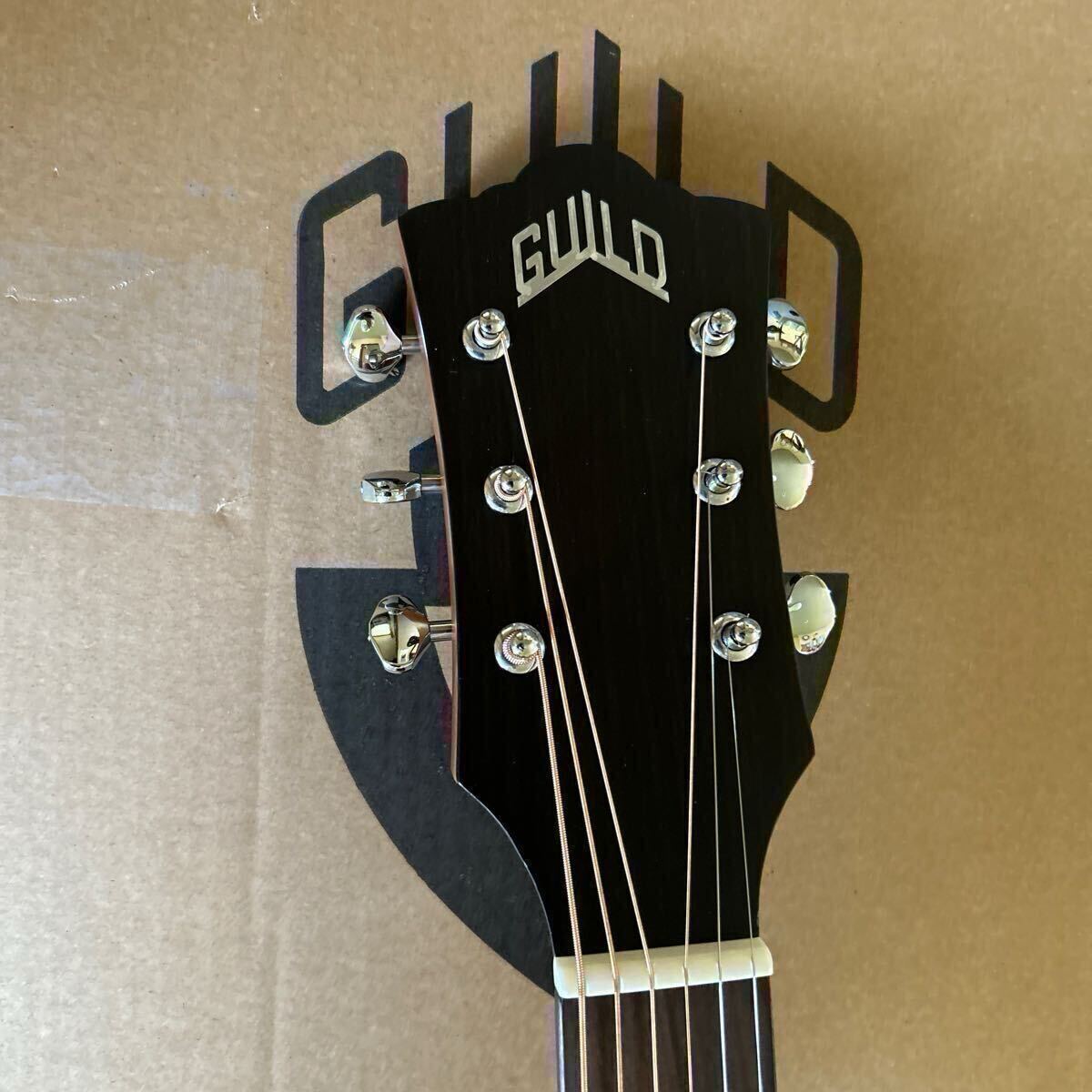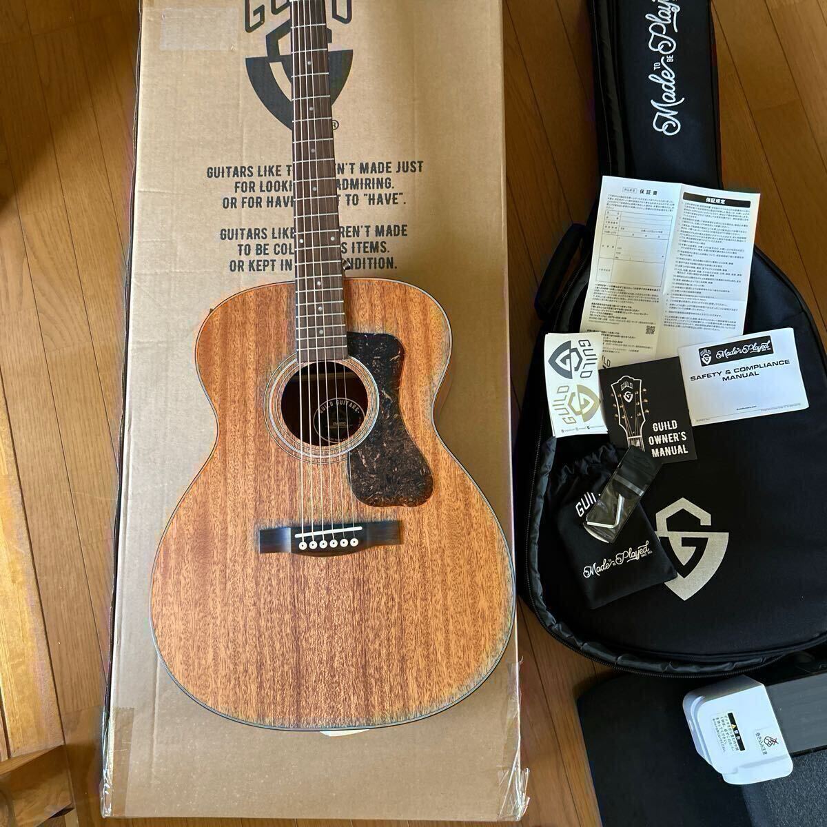 マホガニー単板トップ、マホガニー・バック&サイド、ブラックバインディングとそれにマッチするブラックべっ甲柄ピックガード、快適な演奏性を実現するCシェイプネック、オープンポア・ナチュラルサテン仕上げ、ローズウッド指板とブリッジ、ニッケル Guild ピーク・ロゴ、ペグにはGuild Vintage 16 Open Gearを採用