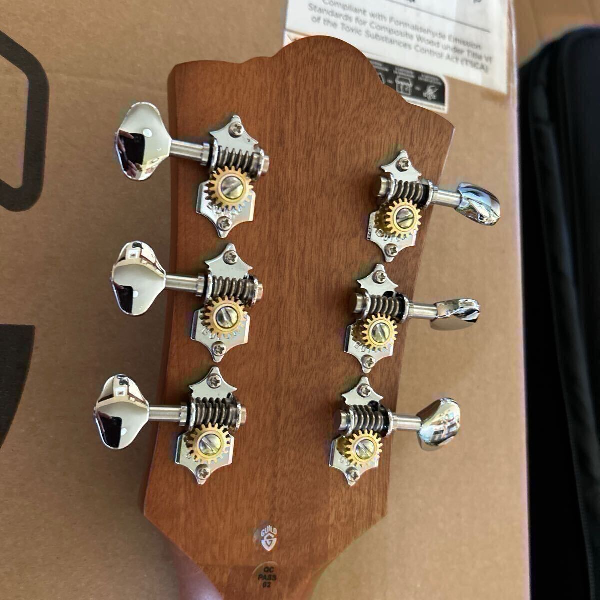 ボディ・シェイプ オーケストラ(OM)、ボディ・トップ材 マホガニー単板、トップ・ブレイシング・パターン スキャロップドX、サウンドホール径 3 7/8イン(98mm)、ボディ・サイド マホガニーボディ・バック マホガニー、ネック材 マホガニー指板・ブリッジ材 ローズウッド、弦長 25 1/2インチ (648mm)、ナット幅 1 11/16インチ (43mm)ナット・サドル材 牛骨フレット数フィニッシュ サテン・ポリウレタン、チューニング・マシン Guild Vintage 16 Open Gear、エンドピン ストラップボタン - ニッケル、ピックガード 黒べっ甲柄、出荷時弦 D'Addario XTAPB1253 Coated Phosphor Bronze Light (.012 -.053)、付属ケース 専用ギグバッグ