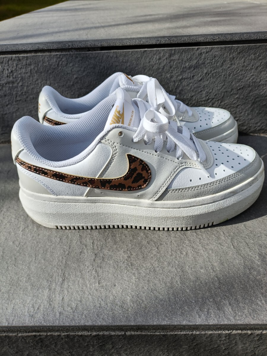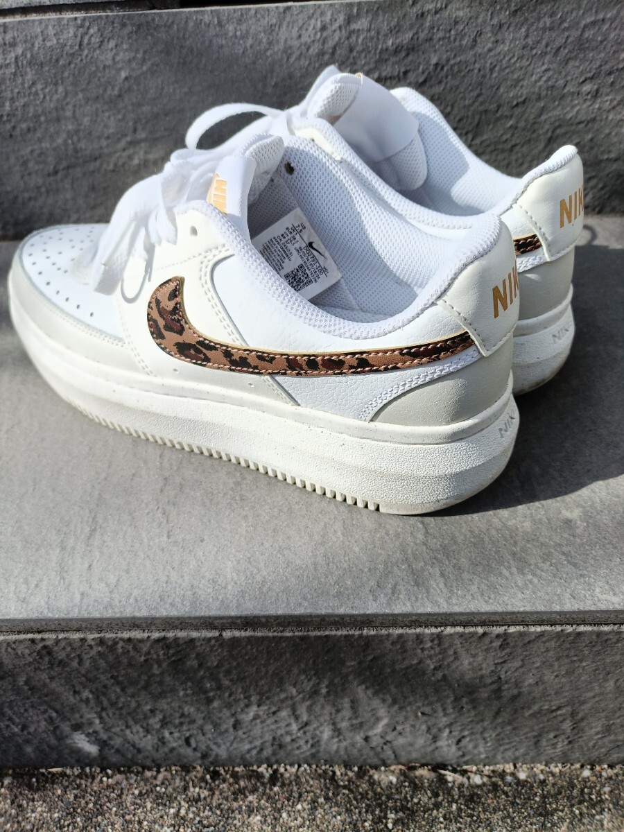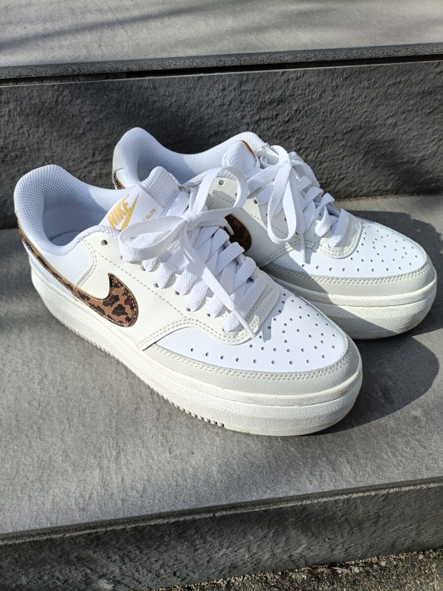 ローカット、ホワイトにヒョウ柄のスオッシュがお洒落なデザインです。
