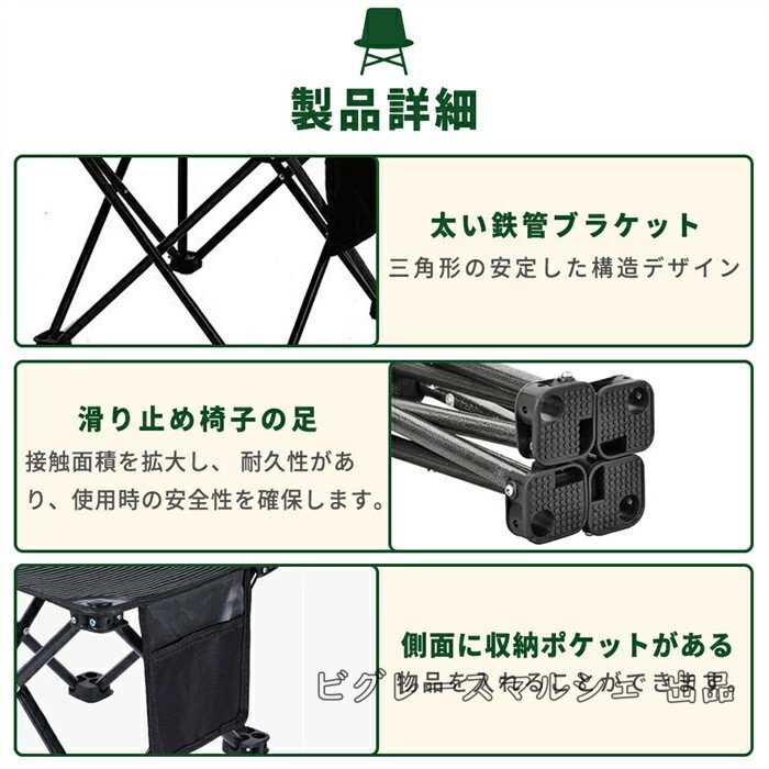 アウトドアチェアは立体的な背もたれと広い座面で、体を優しく包み込むリラックス設計。頑丈な鉄管フレームと滑り止め付きの足で、100kgまでしっかり支えます。
