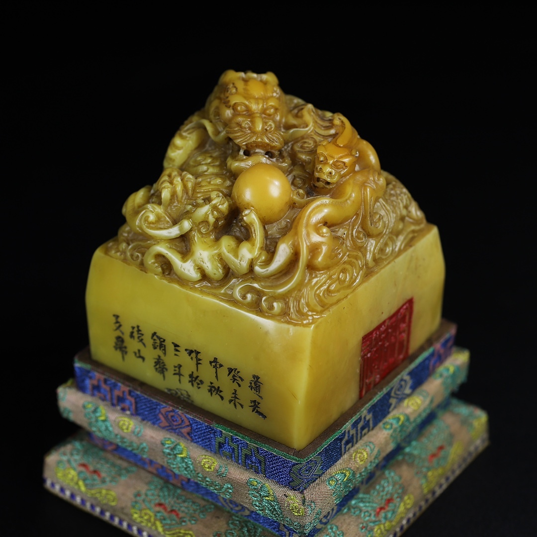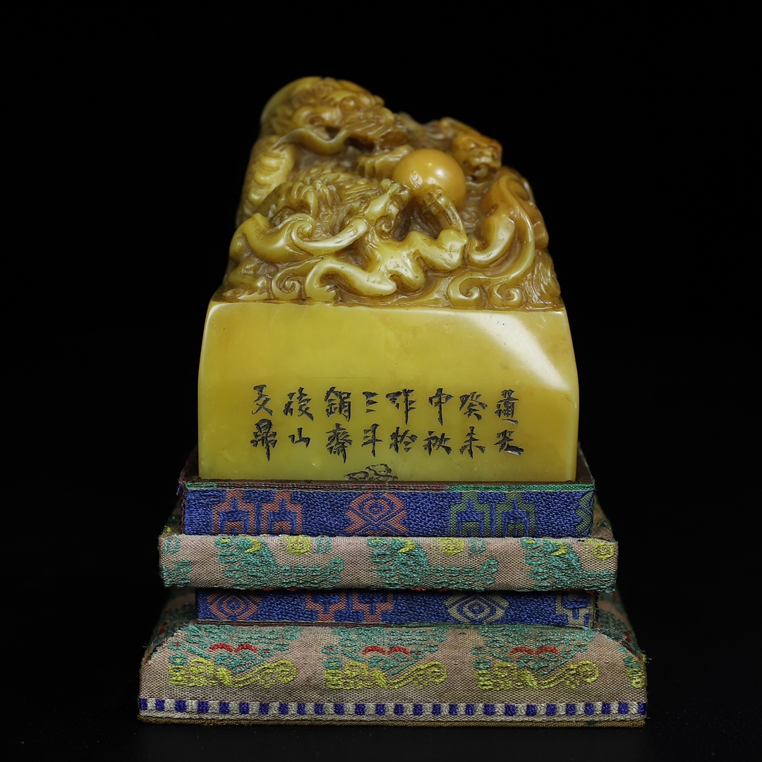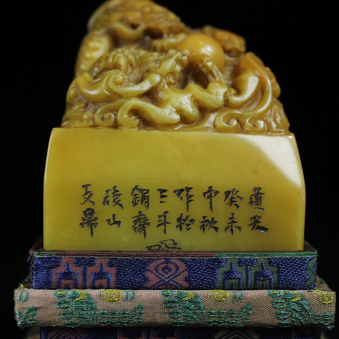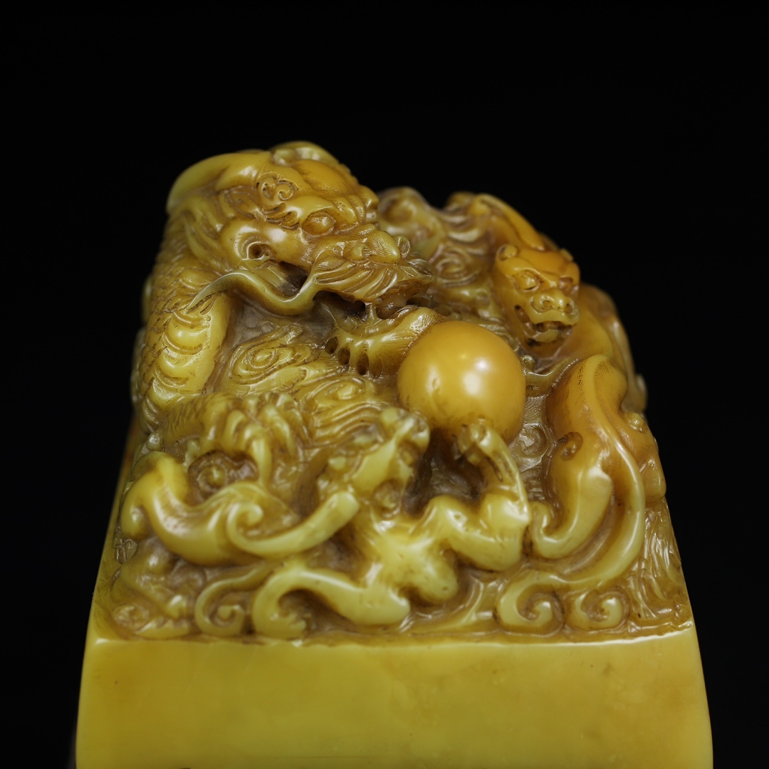 旧蔵 【清代篆刻家 文鼎】寿山石 田黄石 騰龍戯珠鈕 印鑑 天然石 手彫 篆刻 古印材 極細工 中国古玩 骨董品 古美味 211