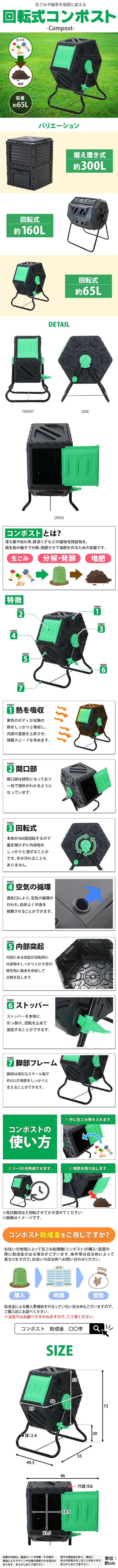 | 商品名 | 送料無料 コンポスト 回転式 65L 回転 小型 軽量 容器 家庭用 ブラック 黒 コンポスター 有機肥料 生ごみ処理器 堆肥製造器 処理器 処理機 家庭菜園 園芸 堆肥 肥料 屋外 雑草 生ごみ 生ゴミ 落ち葉 枯れ葉 庭 畑 ガーデニング おしゃれ compostt55 |