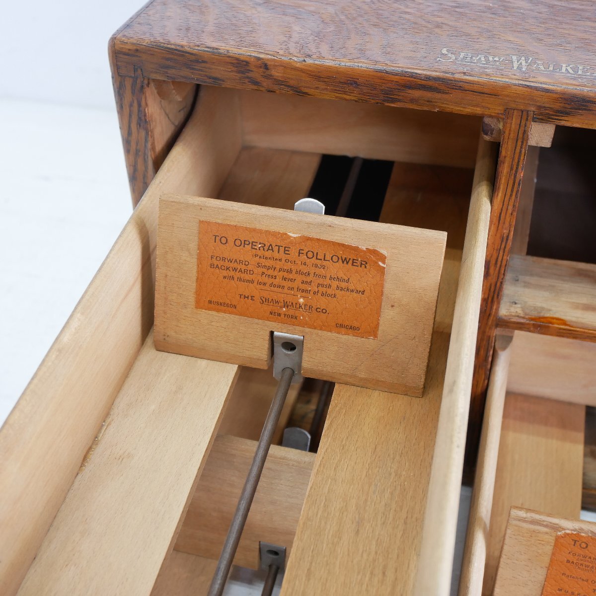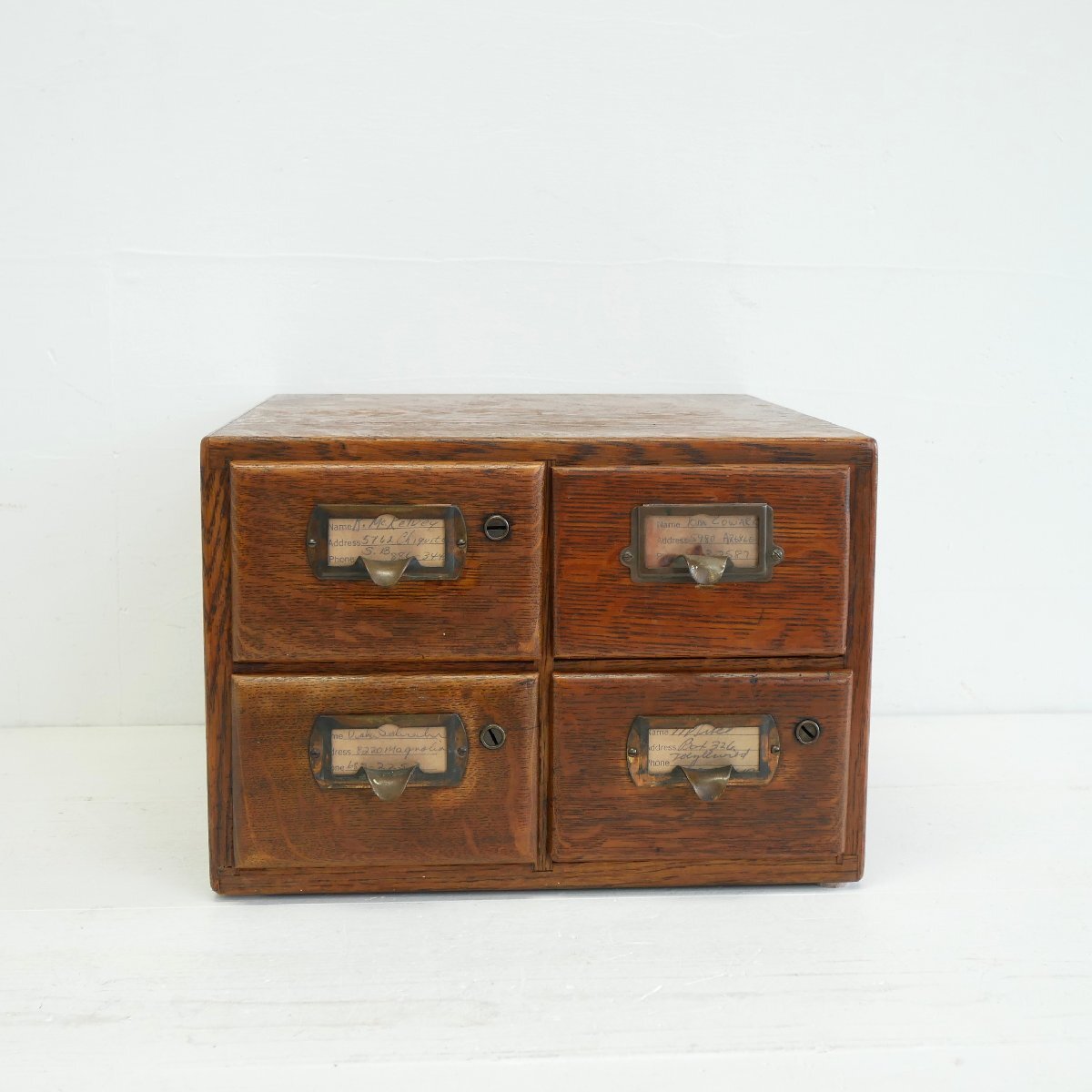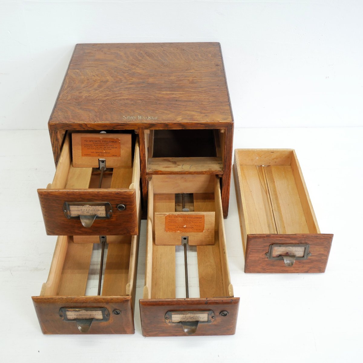 | 商品説明 explanation | 1910年から1930年代頃の木製(オーク材)カードケースです。 「THE SHAW-WALKER CO.」製 1899年にミシガン州で創業したオフィス家具メーカーです。 取っ手がジャパンカラーになっています。 ※ジャパンカラーとは1900年初頭から1930年代頃までに見られるカッパー色を用いた仕上げのことです。アメリカでは「JAPANNED」と呼ばれています。 重厚感のあるヴィンテージケースを、カードなどの収納にいかがでしょうか。 |