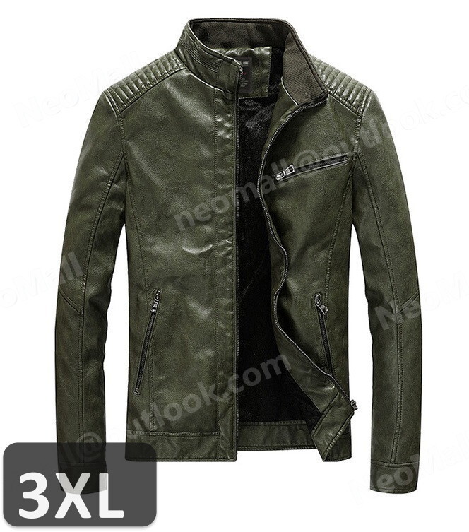 メンズ レザージャケット【985】グリーン 3XLサイズ 裏起毛 革ジャン バイクジャケット ジャケット PUレザー ブルゾン ライダーズ