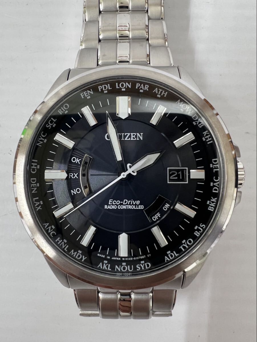 【71761.1121K】★中古 現状稼働★ CITIZEN/シチズン Eco-Drive H145-S073545 電波ソーラー 三針 デイト 腕時計 黒文字盤