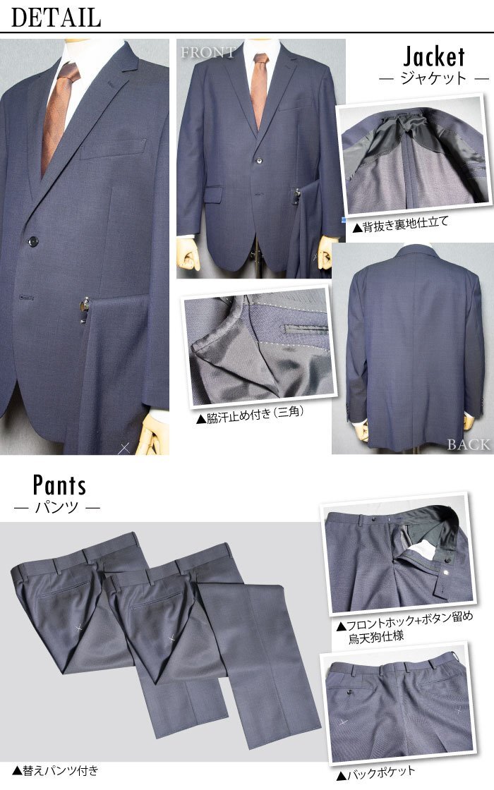 | ジャケット | シングル2ボタン 細めノッチドラペル 背抜き裏地 センターベント 袖3ボタン ボタンクロス留め 開き見せ仕様 ピンポイントステッチ Dカン 汗止め付き(三角) お台場仕立て |