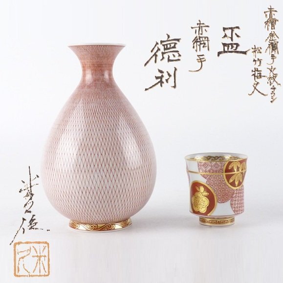 米久和彦「赤網手 徳利」「赤繒金襴手丸紋チウシ 松竹梅文 盃」共箱