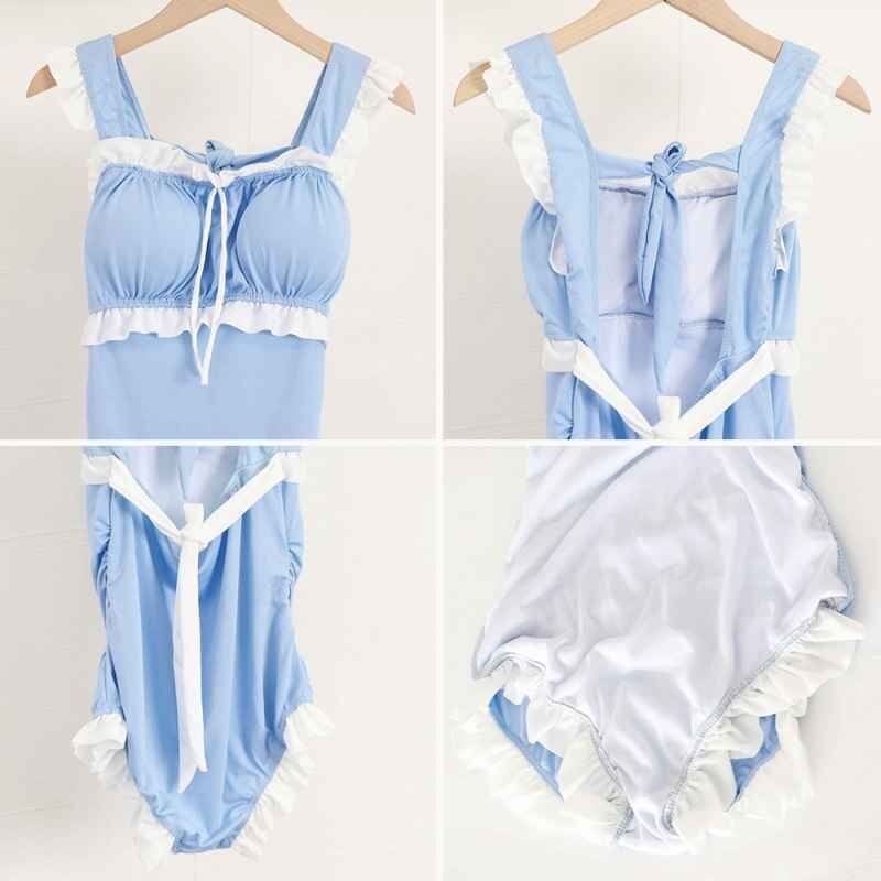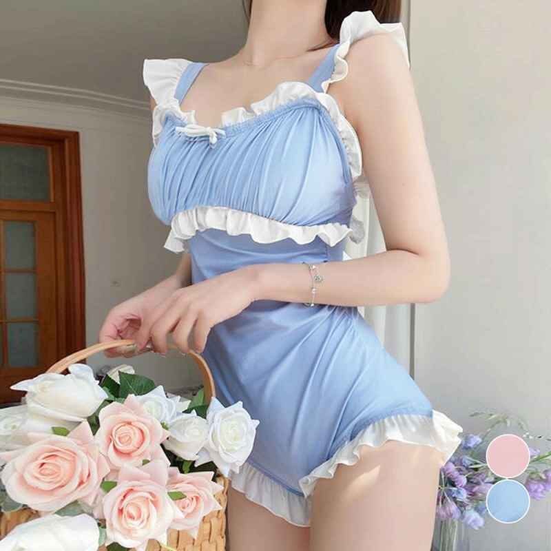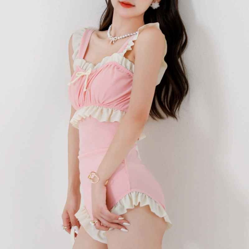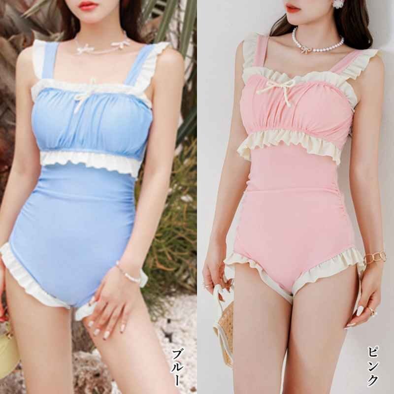 フリル仕様の韓国風モノキニワンピース水着です。甘すぎないフリルデザインで大人可愛いスタイルに◎