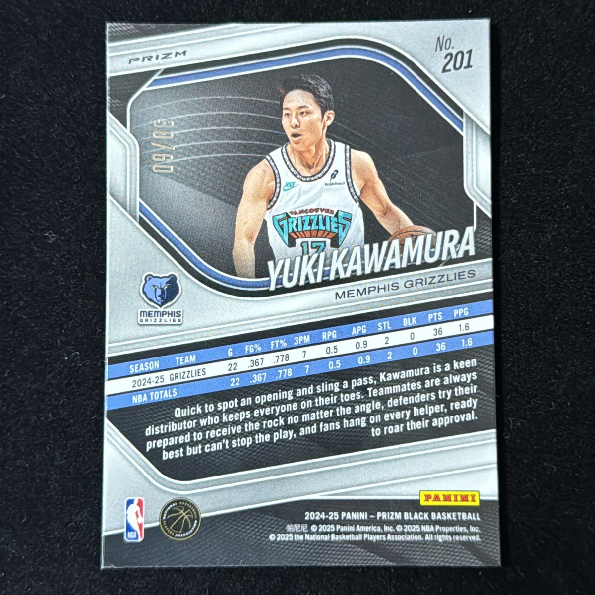 【60枚限定】河村勇輝 Kawamura Yuki Panini Prizm Black 2024-2025 /60 RC グリズリーズ Grizzlies