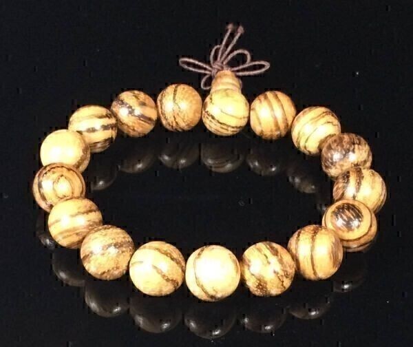沈香はもともとたいへん希少で、近年ワシントン条約で収穫が禁じられたためほとんど流通がありまん。もしあっても20万円前後と高価です。この品物はベトナムで人工的に栽培されるもので、独特な栽培技術によって香りの高い逸品に仕上がっています。はずした後も微かに香るくらいの香りです。天然では虫食いや風雨による偶然的な防腐作用を待つのですが、ここ数年は人工的に樹脂化させる栽培沈香が主流で、こちらもそういう沈香です。それなりに高価ではあります。沈香の香りには鎮静効果があります。心を落ち着けたい時にピッタリです。いわゆるお数珠ではありません。男女兼用のブレスレットとしてお役立てください。