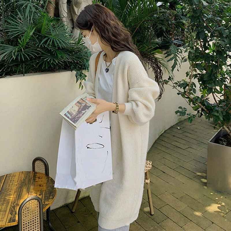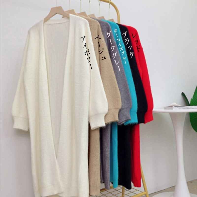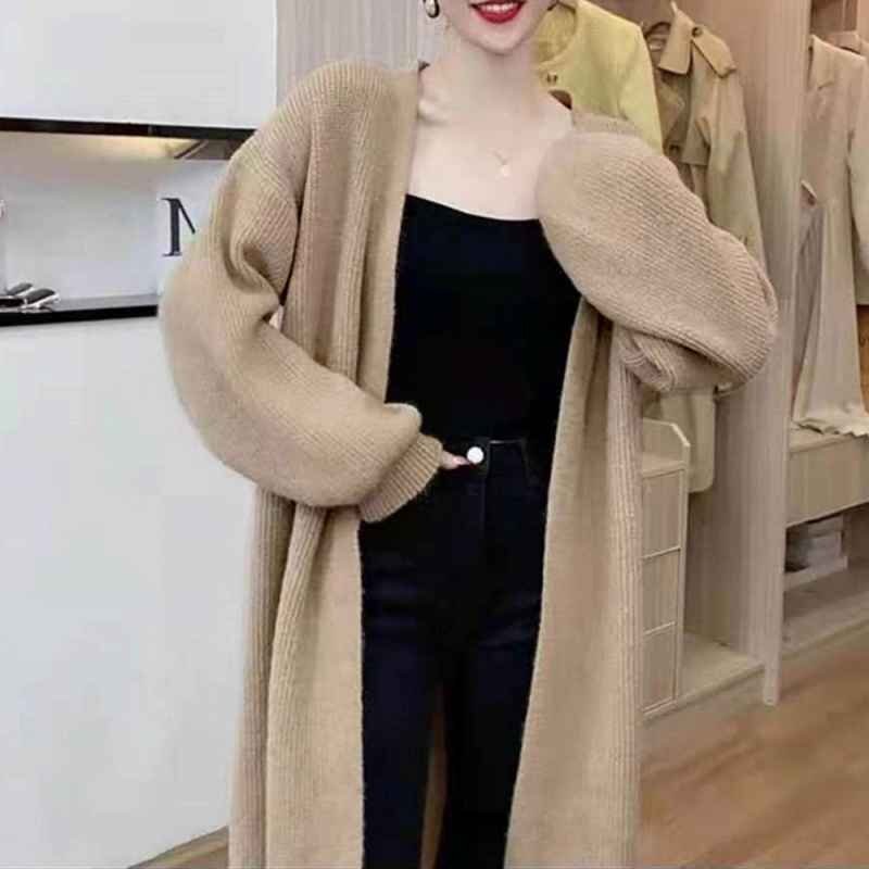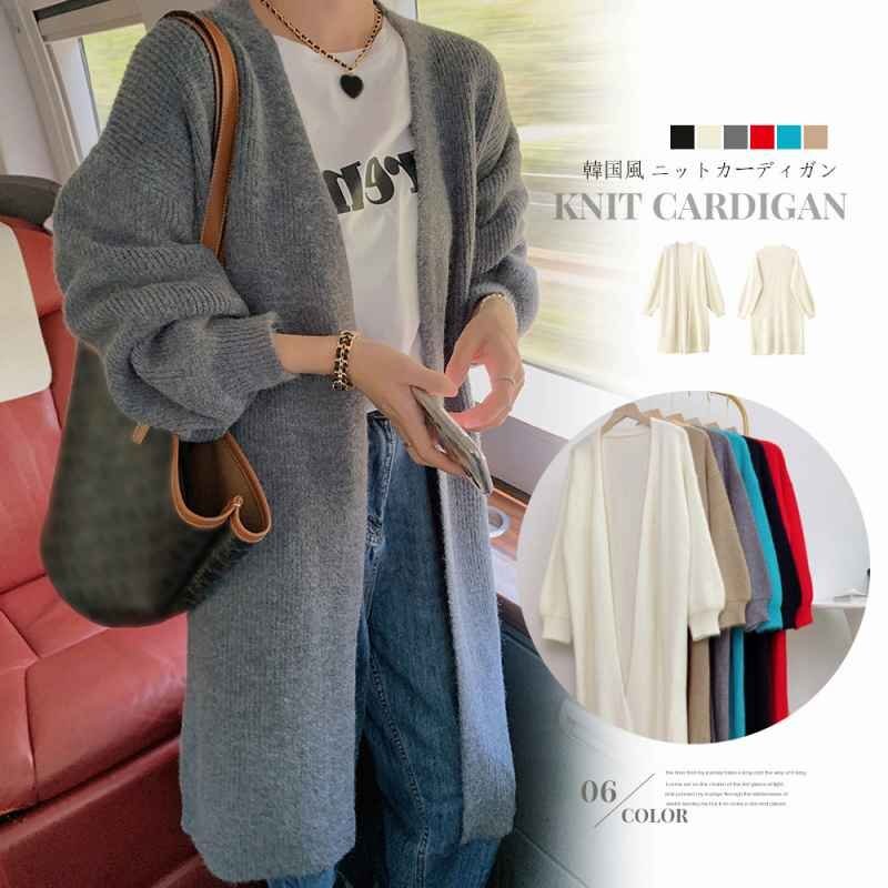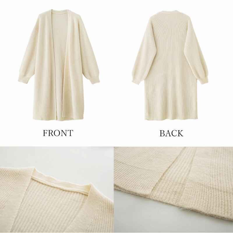 ゆったり羽織れるロング丈のボリュームスリーブトッパー仕様ニットカーディガン