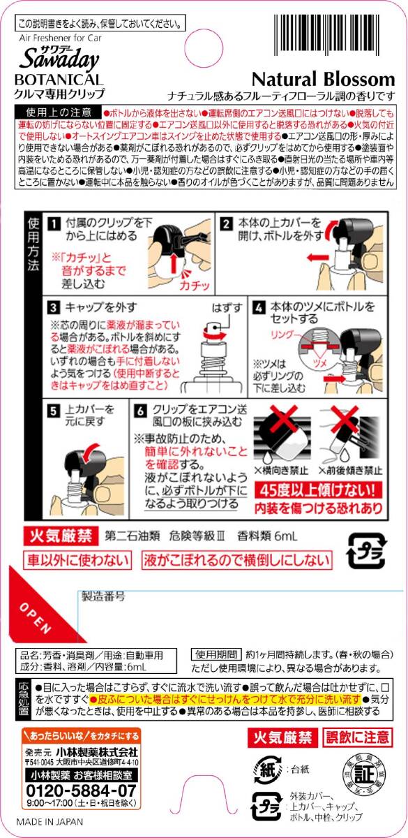 | 商品名 | Sawadayクルマ専用ボタニカル ナチュラルブロッサム 6ml 容量6ML 小林製薬 芳香剤・車用 |