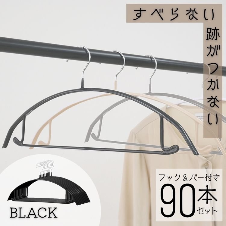 滑り止め加工が施されたハンガーです! 滑りやすい素材やデリケートな衣類でもしっかりとキャッチします。 型崩れしにくい三日月型デザインで洋服の形状に適応します。 跡がつきにくく、変形やシワを最小限に抑え、綺麗に保ちます♪ 便利なフックとバー付なので、キャミソールやボトムス、タオル等を掛けるのにも最適です◎ スリムデザインのため、木製やプレスチックハンガーより空間を節約できます! 軽量でありながら丈夫なスチール素材を使用し、重めのコートを掛けても変形しにくいです。 【商品仕様】 カラー:ブラック サイズ:(約)42×20×1.2cm 重量:(約)110g 材質:PVC / スチール 他 【商品内容】 ハンガー ×90本 |