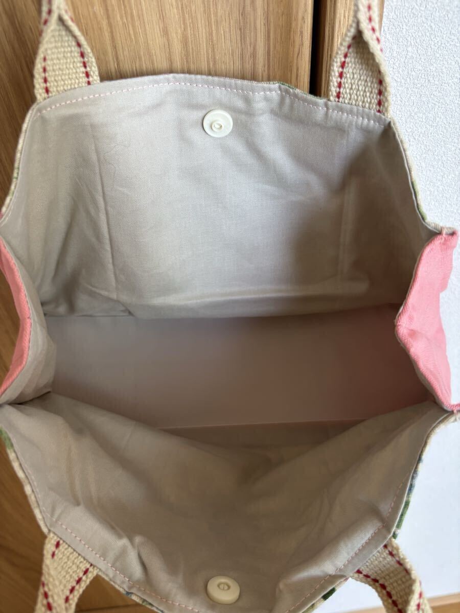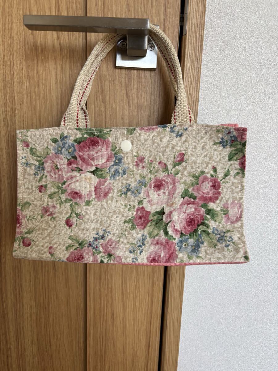 ダマスク柄に薔薇の花束がおしゃれな生地でスナップ付きミニトートバッグを作りました。中布はベージュ系のシーチングになります。