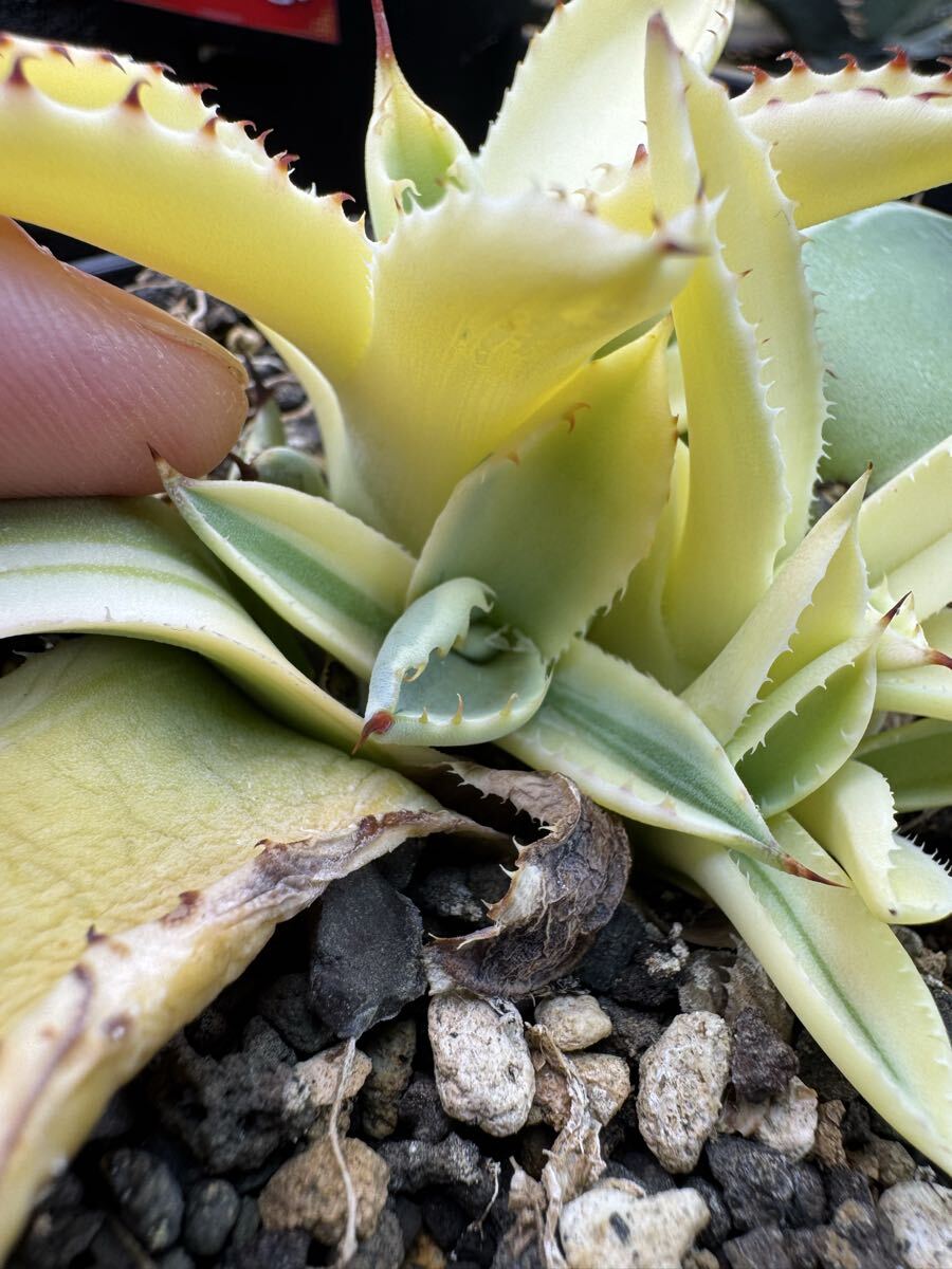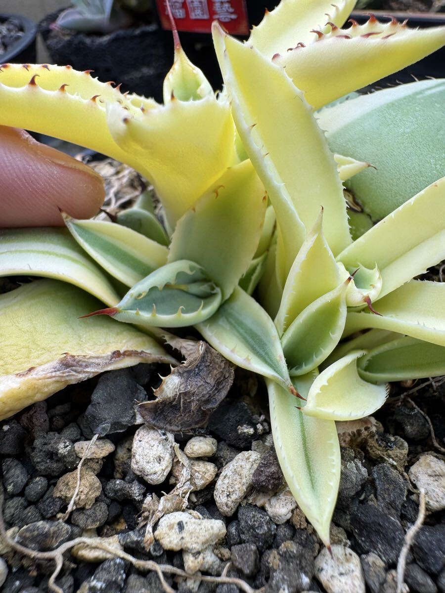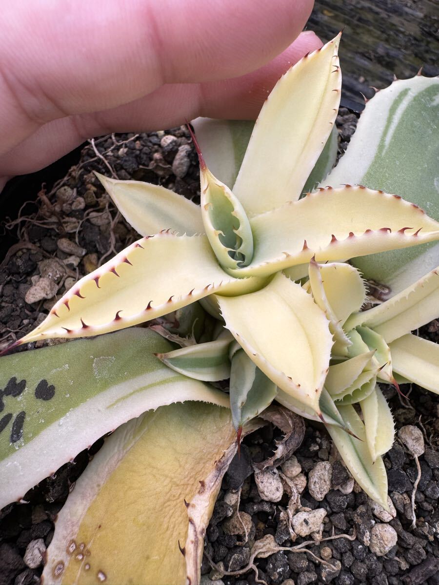 指を添えている子株と、3枚目写真の仔株2株セットになりますが、3枚目の個体は98%斑入りなので死んでしまう可能性がございます。