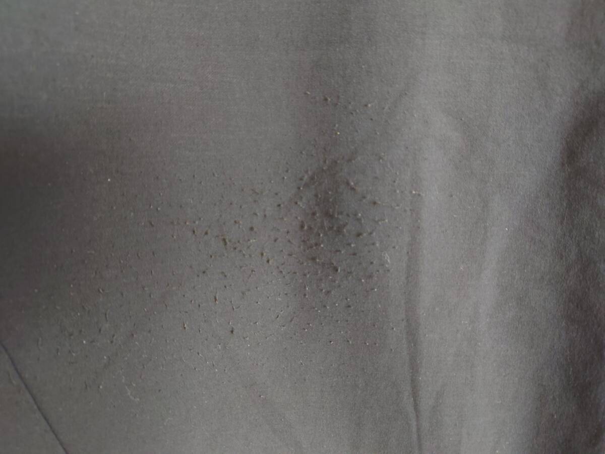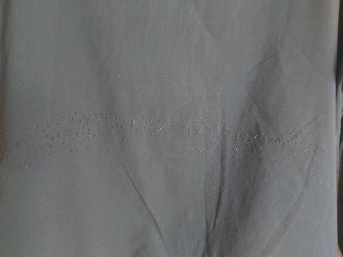 ブラックなので遠目では分かりませんが近くで見ると、画像5と6のようにお腹部部分、背中部分に比較的広い範囲での毛羽立ちが見られます。生地自体の破れなどはありませんので、部屋着、もしくはアウターの下に着用して外出する上では問題ないかと思われます。