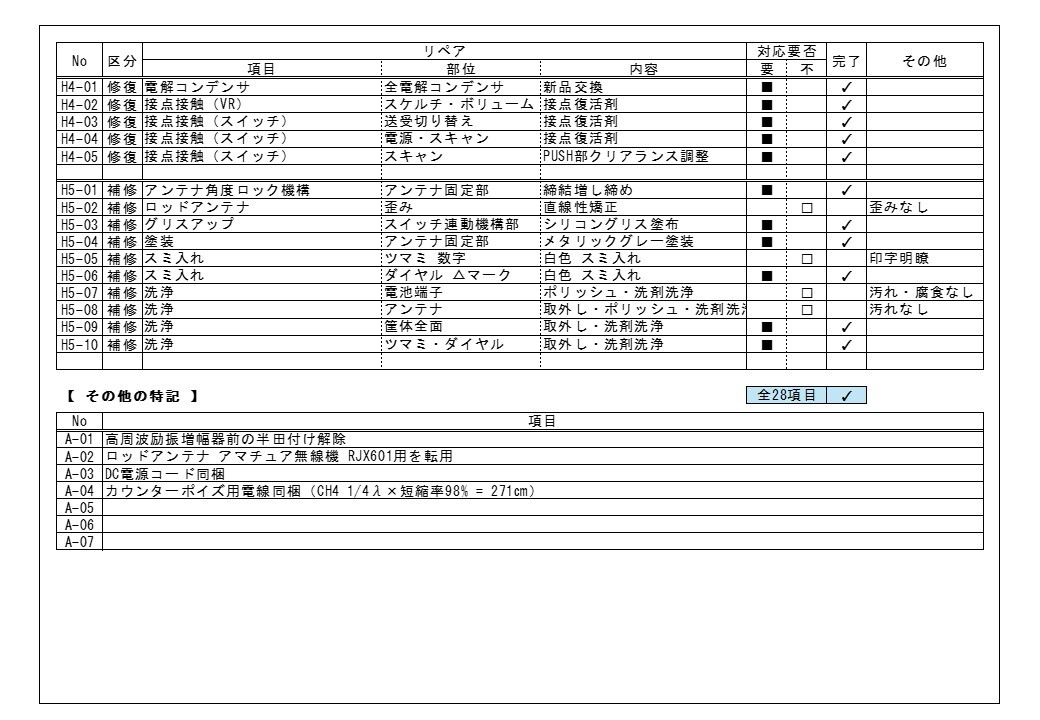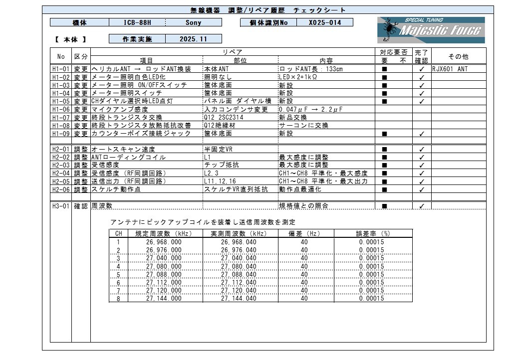 | CH | 規定周波数 (MHz) | 実測周波数 (MHz) | 偏差 (Hz) |