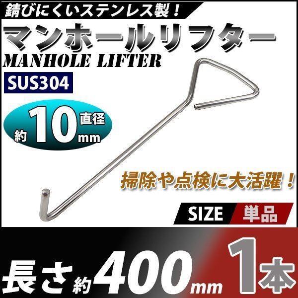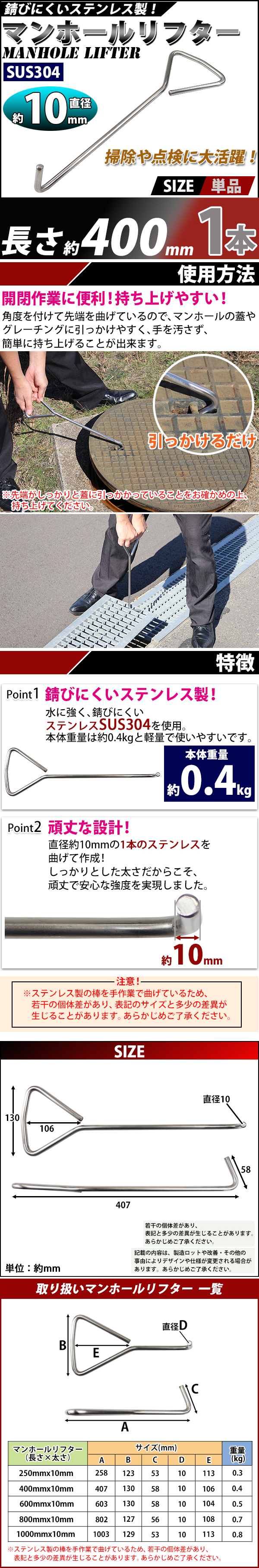 | 商品名 | 送料無料 マンホールリフター 1本 ステンレス製 ハイグレードモデル SUS304 直径約10mm 長さ約400mm マンホール グレーチング フック リフター グレーチングフック マンホールフック ハンドホール 肉フック 側溝 溝 蓋 フタ 鉄蓋 1台 開閉工具 開閉 sus 304 mlifter400 |