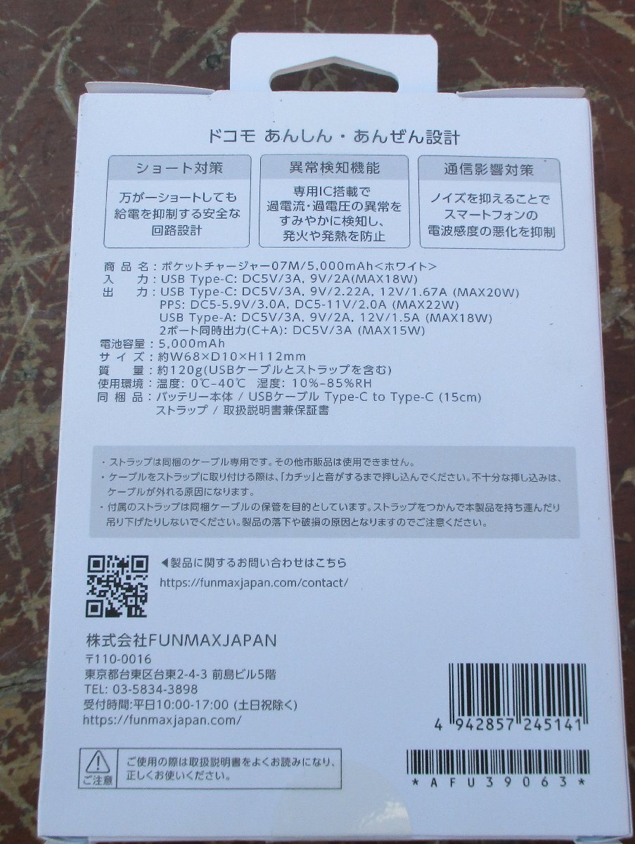 あんしん・あんぜん機能:過充電保護、過放電保護、ショート保護
