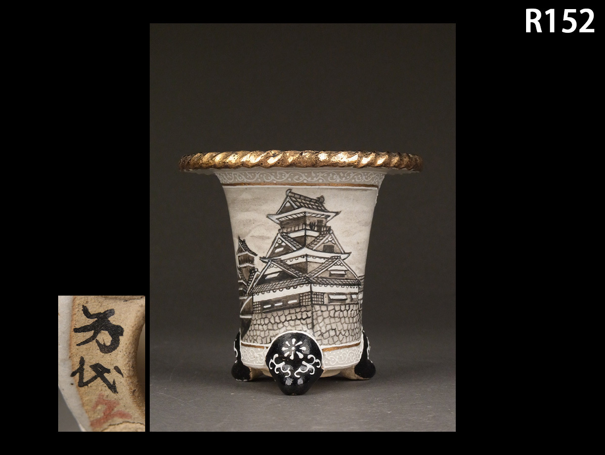 | 京楽焼 作家物 城郭 兜文 万年青鉢 高さ約10,6cm | ||||