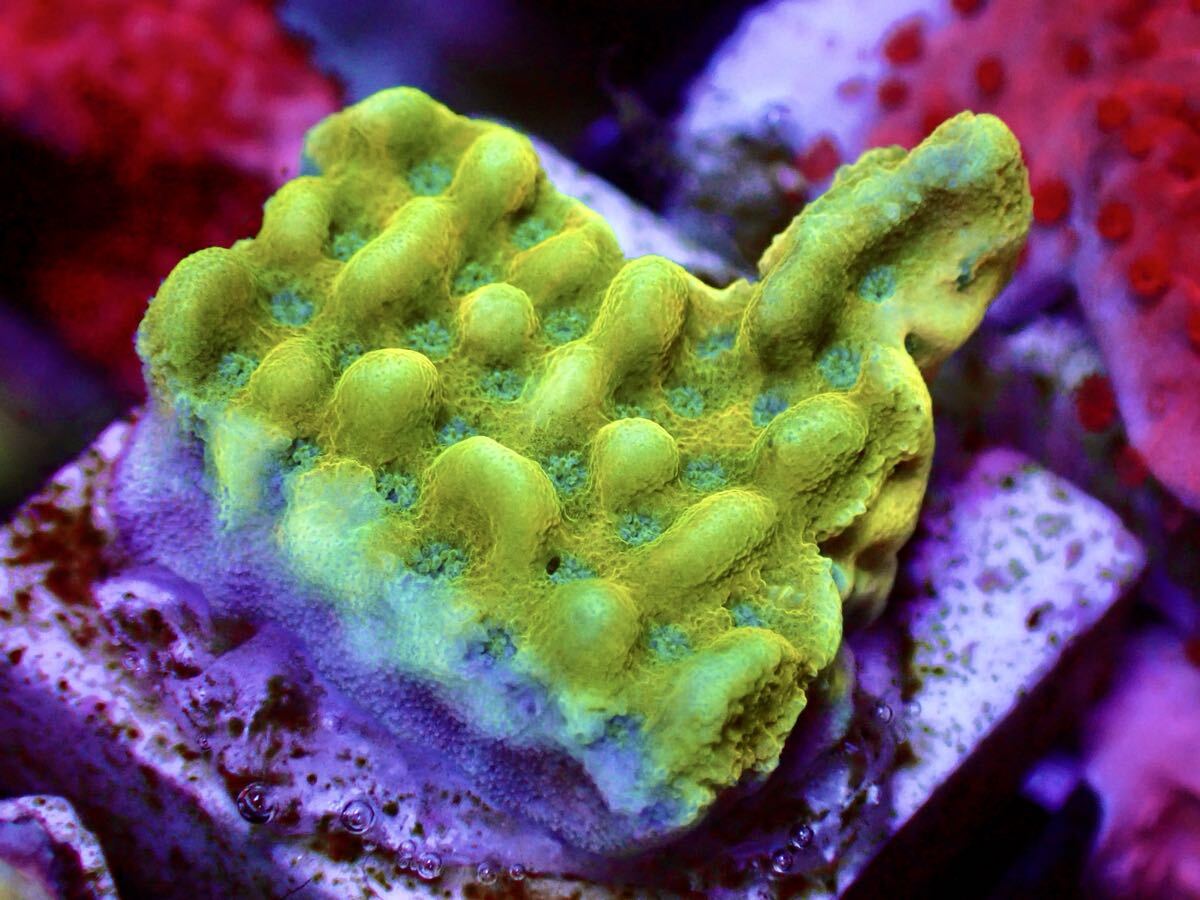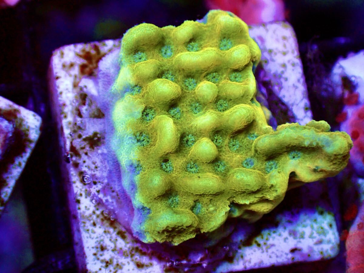 光り輝くイエロー、ポリプグリーンが特徴的な個体です。
