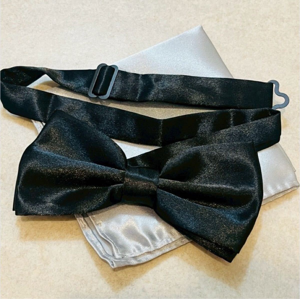 ブラック蝶ネクタイとホワイトチーフ、黒のカフスがセット、フォーマルな装いを上品に仕上げます
