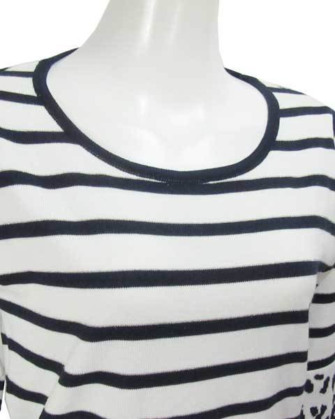| コメント | 白地に黒に近い紺のボーダーニット。 お袖口はパンサー柄で遊び心のあるオシャレなデザイン。 きれい目パンツやスカートからカジュアルなパンツなど コーディネートしやすいアイテムです。 |