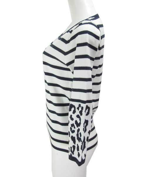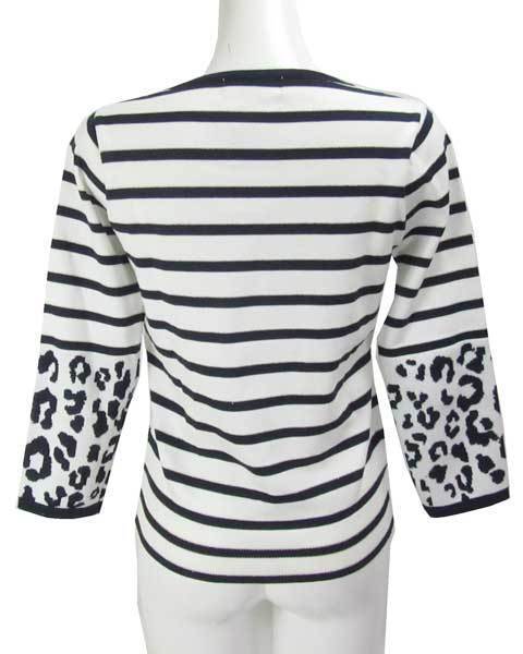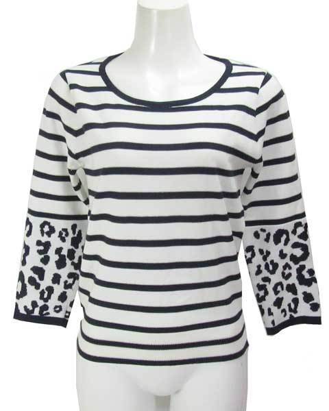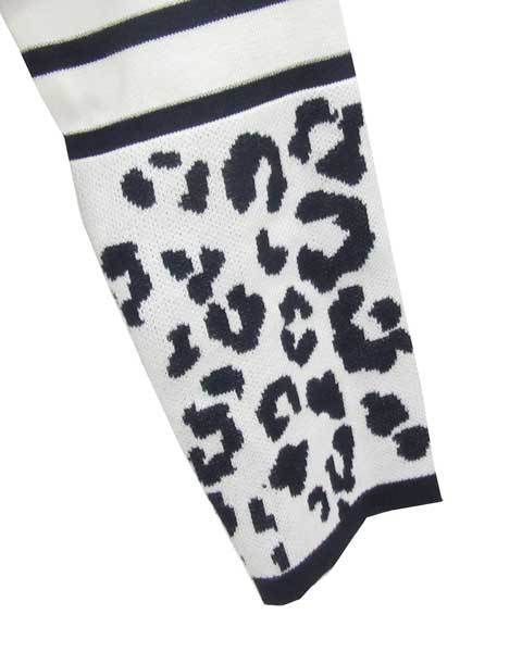 | 白地に黒に近い紺のボーダーニット。お袖口はパンサー柄で遊び心のあるオシャレなデザイン。きれい目パンツやスカートからカジュアルなパンツなどコーディネートしやすいアイテムです。 |